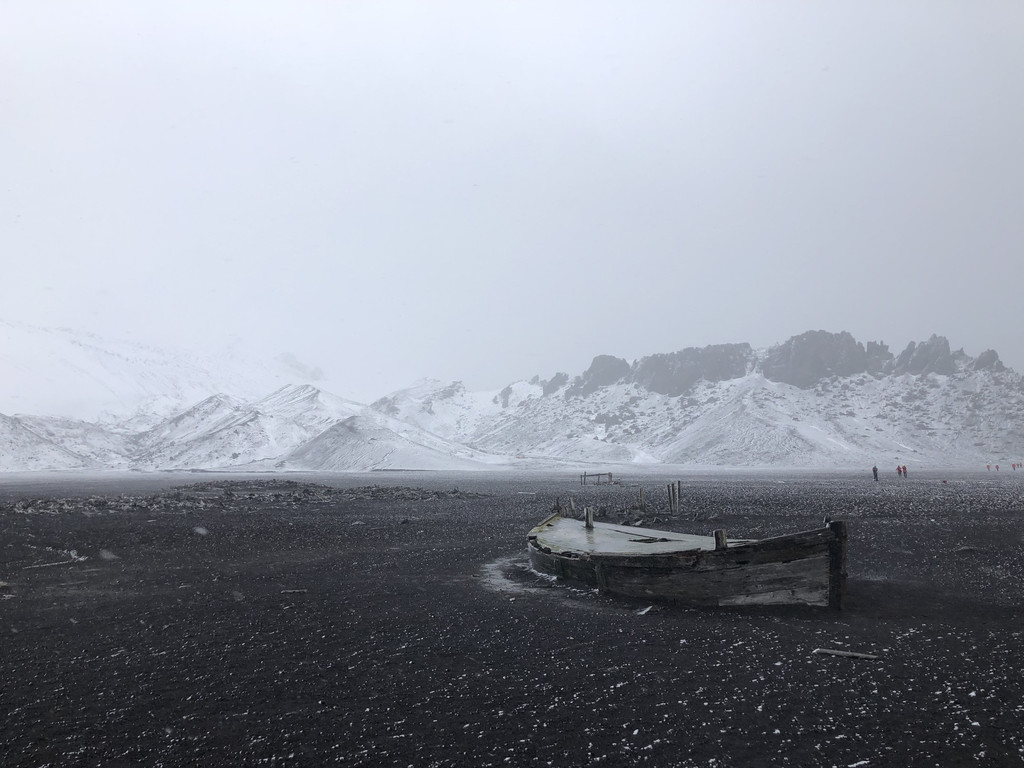 迪塞普申岛又叫欺骗岛是一片位于南极洲东北的南设得兰群岛上,由黑色火山岩形成的小岛,它是南极洲的活火山之一。在远古冰川纪时期,南极海底火山喷发,火山口塌陷,形成了这个天然港湾。这个环形的火山岛只有一个非常狭窄且常年大风的入口,入口处约 200 米。因此,船只只有大约 100 米宽的有效通行空间,需要十分精准的定位。一旦安全通过入口,船的右舷方向就是我们计划登陆的捕鲸者湾了。这里在 19 世纪初曾经是捕鲸船的加工厂,因此,海滩上留有捕鲸加工的遗迹和鲸的骸骨。同时,海滩上还有一个因为 1967 年火山喷发而被废弃的科考站,也是历史遗迹之一。其“欺骗”名称的由来就是因为这是个环形火山岛,从外部看,岛屿是一体的,直到人们找到一个缺口,才发现它其实是一个被淹没的破火山口。所以说,欺骗岛从来没有撒谎,欺骗我们的是我们自己的眼睛。