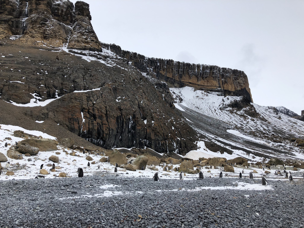布朗断崖位于南极海峡岸边、南极半岛的最高处。顾名思义,这里的主要自然景观是一处高达745 米的悬崖。高耸的锈黄色的绝壁是火山的起源,海滩上到处是熔岩“炸弹”。布朗断崖是阿德里企鹅,巴布亚企鹅,黑背鸥和岬海燕繁衍下一代的圣地,而威德尔海豹则是这里的常客。布朗断崖是真正意义上的南极大陆了,虽然这里只是南极半岛上的小尖尖,但与离岛的概念是完全不同的,踏上岛屿只能说来过了南极洲,但是踏上这里那就是不折不扣的南极大陆了。数百米高的断崖并不算是那么特别,但当断崖下面有企鹅、海豹和蓝眼鸬鹚时,便赋予了这个断崖更多不同的意义。