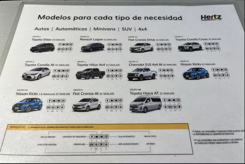可租车型分为几档,GRUPO C和G H1是最便宜的车型,这两档车不能开去智利。