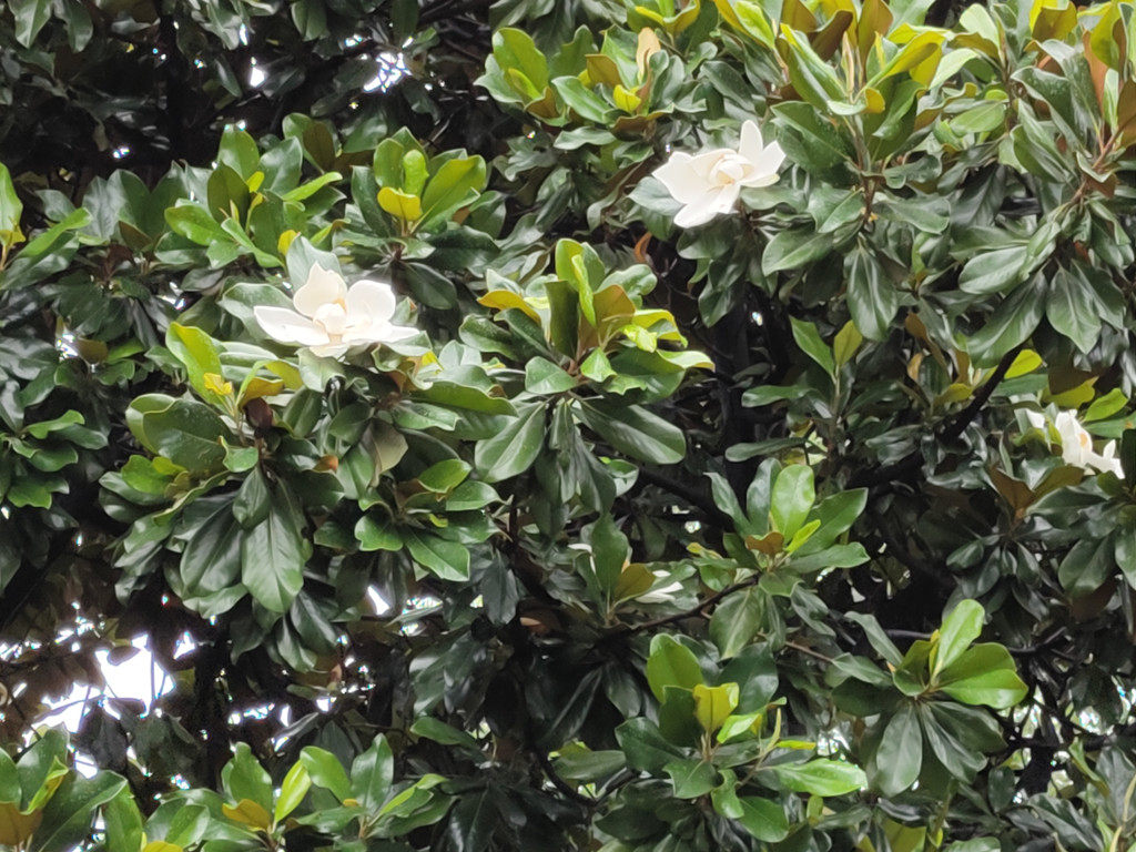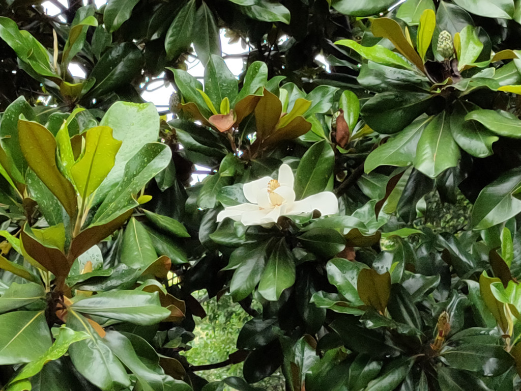 广玉兰是一种高大的乔木,它们的花朵总是半隐在碧叶丛中。一般来说,我们要仰起头,才能看到这些洁白的花朵儿。蜀冈的广玉兰却不然,当然也有高大的树种,但也有还没有来得及长得高高大大的,它们的枝叶早早地向外伸展,花朵儿有时候就在我们能够平视的地方,或者踮起脚尖,就能够凑到它的面前。