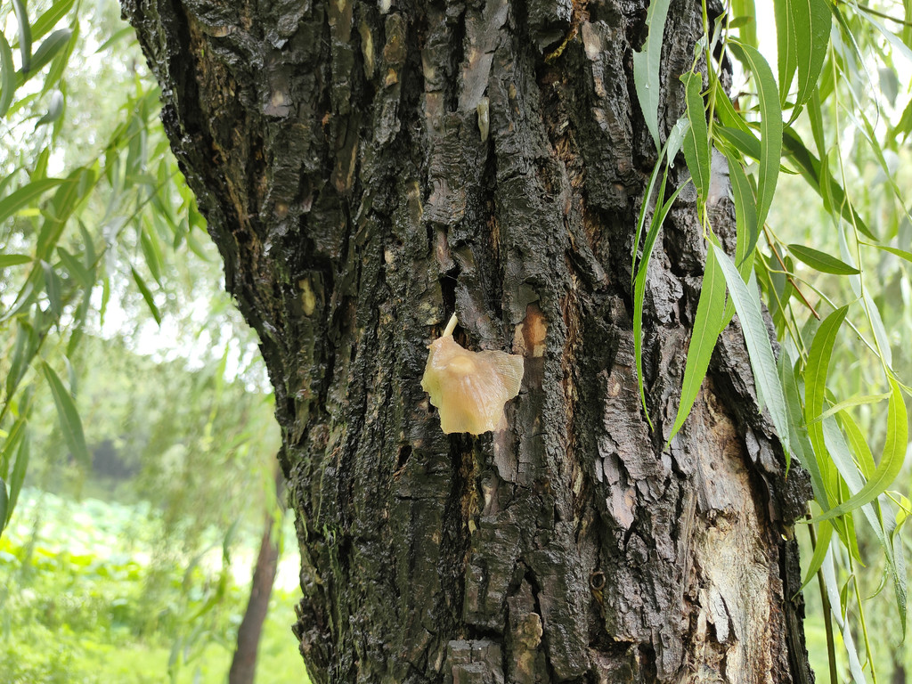 在一株粗大的柳树树干上,眼尖的小伙伴发现了一朵菌类,不知道是什么品种,从树干的缝隙里探出来,仿佛一把粉嫩的小伞。