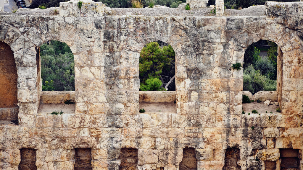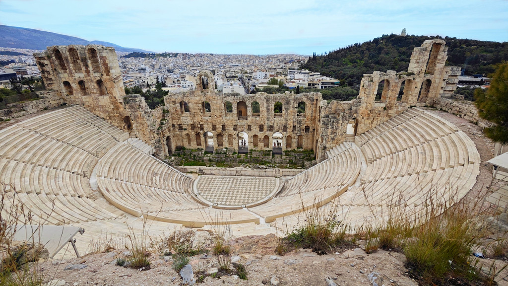 我们在卫城景点的检票口的进入后,最先看到的其实不是卫城山门,而是阿迪库斯音乐厅(Theatre of Herod Atticus),阿迪库斯剧场于公元1世纪,保存得十分完整,现在还在使用。著名的音乐家雅尼,1994年也在此开过音乐会。剧场是以一位罗马富翁的名字命名的,据说他把大半积蓄都用于修建公共建筑。160年,他为了纪念爱妻而出资兴建了这座剧场。现在这座剧场已经成为每年夏季举行的雅典艺术节的主要演出场地。平时不对外开放。另外一侧的是献给酒神的狄俄倪索斯剧场(Theatre of Dionysus)。