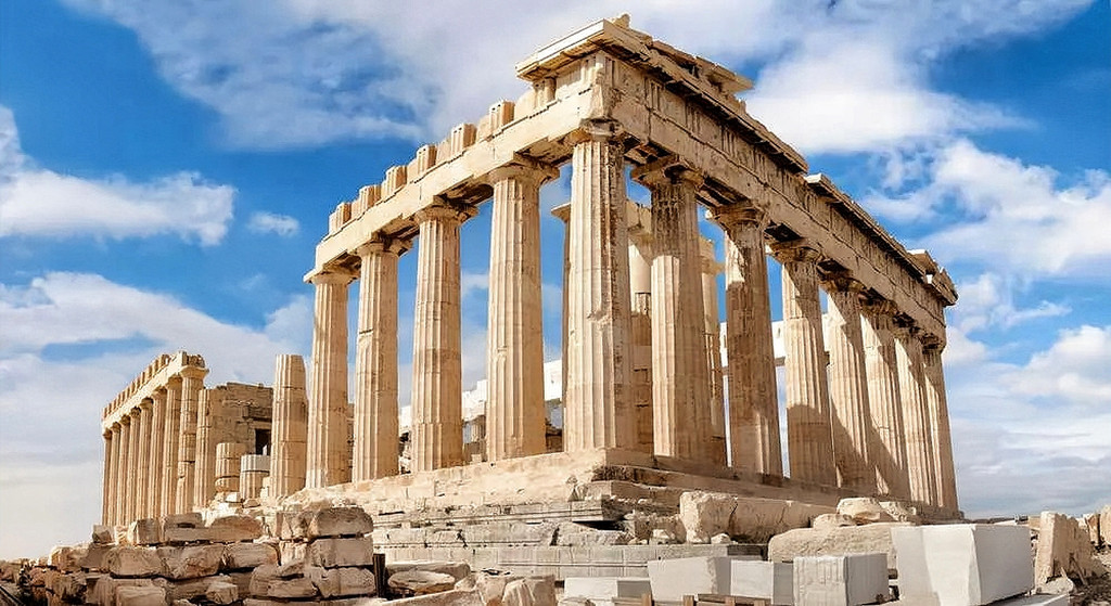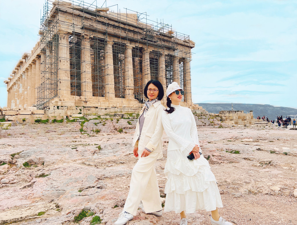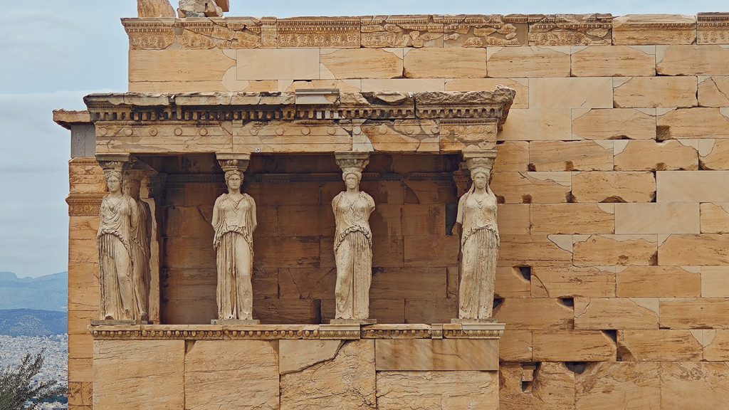 穿过山门往上走,地势越走越高,右边是宏伟的帕提农神庙(Parthenon),是古希腊奉祀雅典娜女神的神庙。从上世纪开始就一直在修复,但却从未被复原。左边则是秀丽的伊瑞克提翁神庙(Erechtheion),是同时供奉海神波塞冬和智慧女神雅典娜的神庙,其中少女门廊(Porch of the Maidens)是神庙最具代表性的景象,由六尊少女雕像支撑殿顶,取代圆柱承重功能,当时因为雕像的脖子处过细不能承受屋顶的重量,设计师就设计了长发和头冠的造型,成就了美学和力学的完美融合。不过目前的都是复制品,5座真品被收藏在卫城博物馆,还有1座在大英博物馆。这两个神庙一个偏纪念性另一个偏装饰性,起着对立统一的构图作用。
