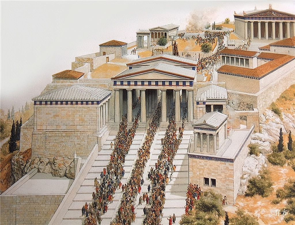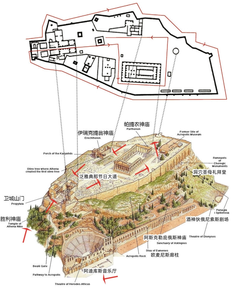 非常可惜的是雅典卫城在希波战争中全部被毁,现在参观的是毁坏后遗址。卫城位于雅典城中心偏南的一座小山顶的台地上,高出平地约70~80米。我们可以随着图中的箭头所示来依次参观。