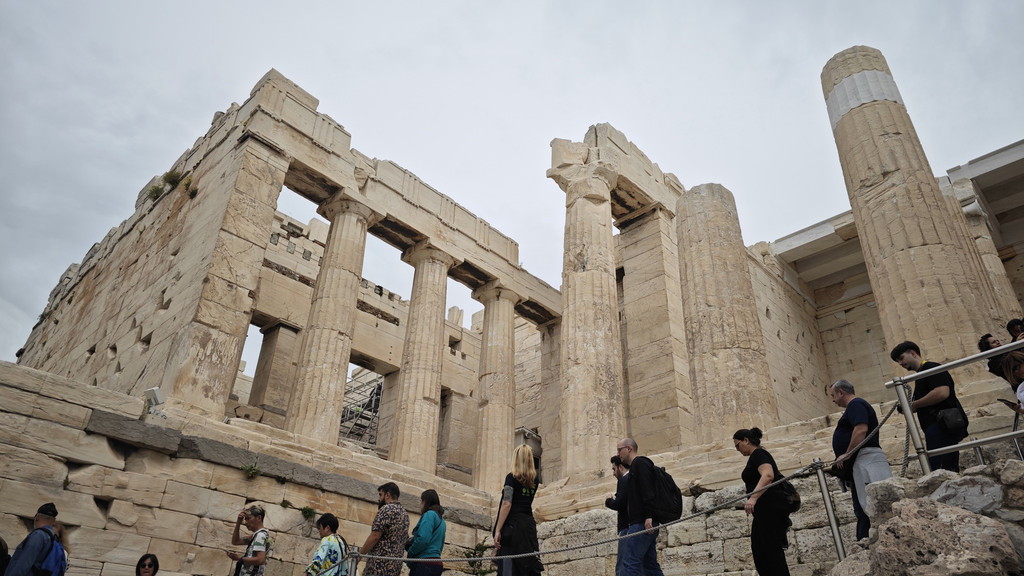 接下来进入卫城山门(Propylaea)它是卫城唯一的入口,这座门通往卫城的圣殿,门分三部份:由左至右为北翼、中央楼及南翼。卫城山门(Propylaea)中央楼有六根粗大的多利安式及奥爱尼亚式列柱巧妙地穿插并列,气势雄伟。以前山门是由两侧的宫殿组成的,如今仅剩五个门的柱子。这个区域人流最多。