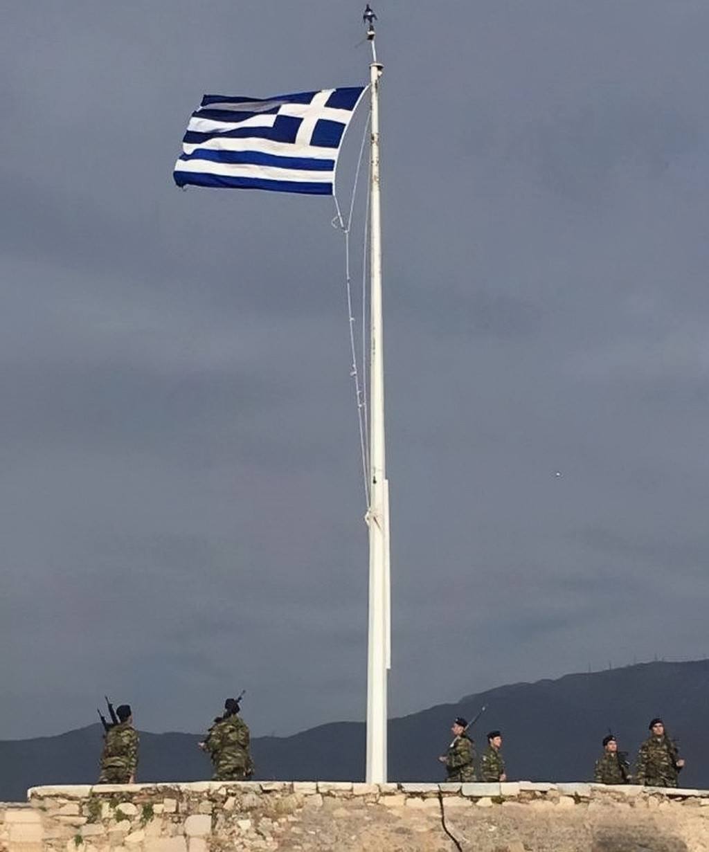 再向前走,是一个巨大的希腊国旗台。这里与我们的北京天安门广场一样,会由希腊的卫兵们,每天迎着阳光升旗,顺着落日降旗。沿着平台可以看见远处的吕卡维多斯山。