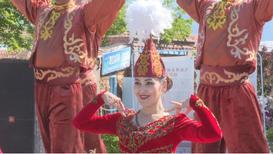 5月19日,中国旅游日,以“绿色发展 美好生活”为主题,特克斯县推出歌舞表演、民宿体验、商品展示等系列活动。在网红离街冬不拉广场,曼妙的舞姿、悠扬的歌声、美味的食品、太极拳展演等让大家大饱眼福。这天一早,游客刘香霞与家人一同感受离街漫时光,异域的风情,新鲜的空气,让她身心愉悦。