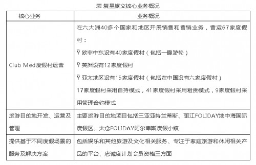 复星旅文专注于旅游和商业领域,2018年在香港联交所主板上市(01992.HK),截至2018年12月31日,复星旅文总资产超过人民币295亿元。公司的核心业务为Club Med度假村运营,旅游目的地开发、运营及管理,提供基于不同度假场景的服务及解决方案三大类。