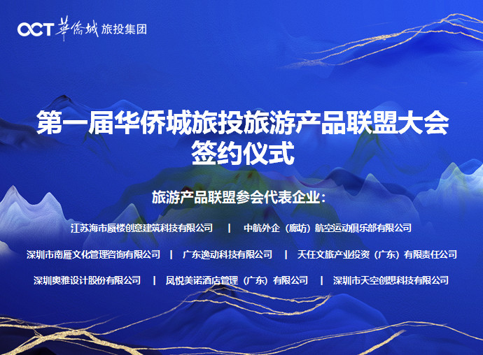 在签约环节,华侨城旅投集团邀请了凤悦美诺酒店管理(广东)有限公司、中航外企(廊坊)航空运动俱乐部有限公司、深圳市南雁文化管理咨询有限公司等十余家企业作为华侨城旅投旅游产品联盟的企业代表,与华侨城旅投集团签订了战略合作框架协议。