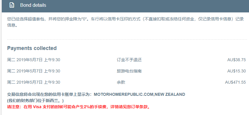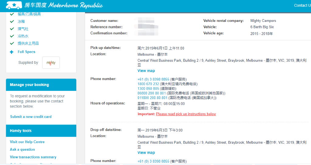 房车是在微信公众号“房车国度”于2019年5月6日预定的,可供6人使用的Mighty。我们11点到达取车地:Central West Business Park, Building 2 / 9, Ashley Street, Braybrook, Melbourne - 墨尔本, VIC, 3019, 澳大利亚。有中文服务,我们买了快速还车服务、行车保险服务。这两个保险建议大家都买,因为我们归还房车的那天墨尔本市区下雨,车很多,路很滑,我们房车的左驾驶门撞到了一个小货车。小货车司机带我们去旁边停车解决,我给保险公司打了电话,糟糕的是接线员是中国人,但是只会说粤语,说了几句我着实听不懂,后来说的英语,要我们拍一下撞车情况、对方司机的驾照,然后我们回到了房车基地,之前那位小姐姐还在,我们把车放下直接就走了,也没有后续再扣信用卡的钱,很幸运。还有房车国度免费给我们翻译了2个驾照,不过我们四个人只有一个是老司机(2年驾龄),出发的之前我们4个的妈特意嘱咐了司机慢点开车注意安全,呵呵,小伙子年轻气盛有自己的想法。对了澳洲由于历史原因,他们的司机位置在车体右边,中国的是左边,拿到车后请一定要在院子里试一下,熟悉的差不多了再开出去。