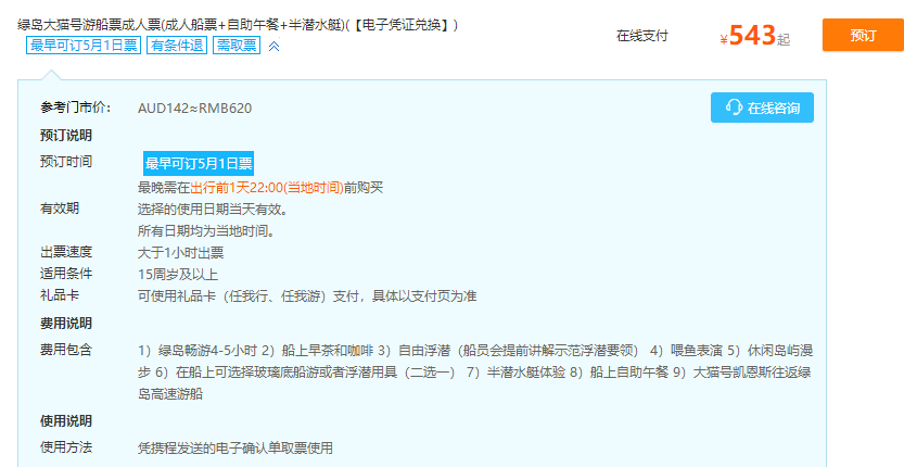 5号的大猫号游船票,两个男士去了绿岛大堡礁潜水Great Barrier Reef Diving浮潜,我们俩女的去参加了玻璃船底看鱼的项目,然后就是在沙滩上看着那俩哥们儿浮潜,太阳很晒,如果不戴墨镜的话,银色的沙滩会很晃眼。他们一个自己带的浮潜装备,很好用、换气很方便不必喝那么多海水,另一个在大猫号上租的,不太好用,没浮几分钟就喝了好多水。沙滩上有一群韩国中学生的夏令营,老师教他们如何浮潜,嗯,他们下水就开始打水仗玩闹,叽叽喳喳的,浮潜啥的好像没人去。注意,在岛上森林里千万不要给“走地鸡”喂食,他们会一大群的追着你要吃的,那种灰黑色的鸟,一直在地上走啊走啊,一不小心你还有可能会踩到它们,有点恐怖。沙滩上的白色海鸥也不要喂,你脑子里想象的可能是碧海蓝天白沙滩,一个慵懒的下午,晒着日光浴喂着大海白色的精灵,非常美好,事实却是喂了一块就会有四五只海鸥为了抢食而打架,成精一点的还会直接向你的面包扑来,特别吓人。我们看到了绿色大蜥蜴,80cm长,它不动,我们呀不敢动,头一次遇到这种活的,不知如何是好,僵持了5分钟左右,它往反方向走了,谢天谢地。