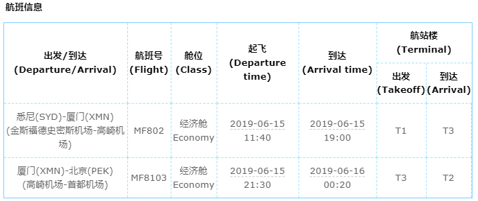 2019年2月购买中国北京到澳大利亚墨尔本的机票---马航,人均票价1400元左右,北京(23:00起飞)到马来西亚(早上7点)转机,再到墨尔本(澳洲时间晚上9点半下飞机),具体不记得了,当时的行程单找不到了。携程上的订单没法查一年之前的,感觉这是个bug。。