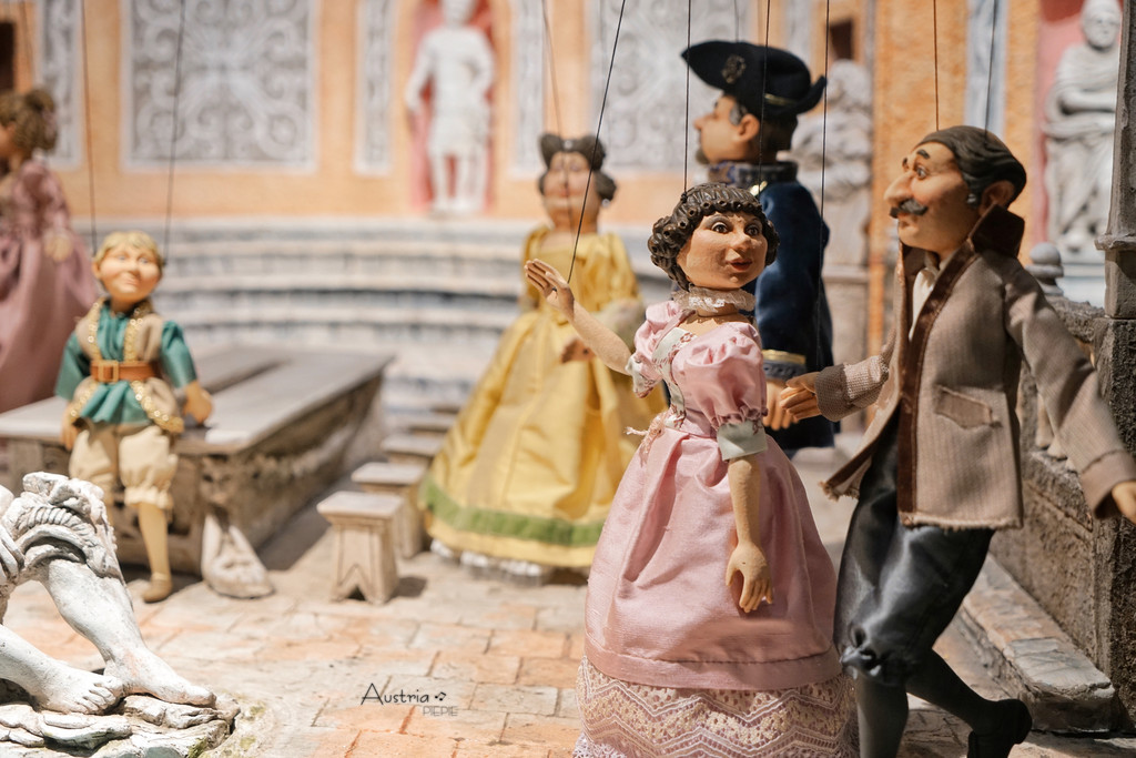 橱窗内展示了各种提线木偶剧的场景,每一个动作、神情都栩栩如生,惟妙惟肖。木偶的轮廓及五官都非常精致,这一个个小木偶都透出了艺术家们的用心和细致。据说在固定时间还是有表演,但我们并没有碰到。