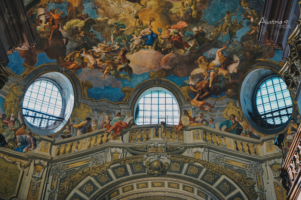 走进教堂,瞬间为内部精美华丽的穹顶着迷了,主祭坛的穹顶四面八角,每一层都有壁画和雕塑,记录了圣经的故事。教堂的整体色调以典雅的白色和灰色为主,巴 洛克 的繁复线条和精细的浮雕随处可见,给人的空间感和立体感特别强烈,有着宗教的色彩,也看到了设计师的想象力。
