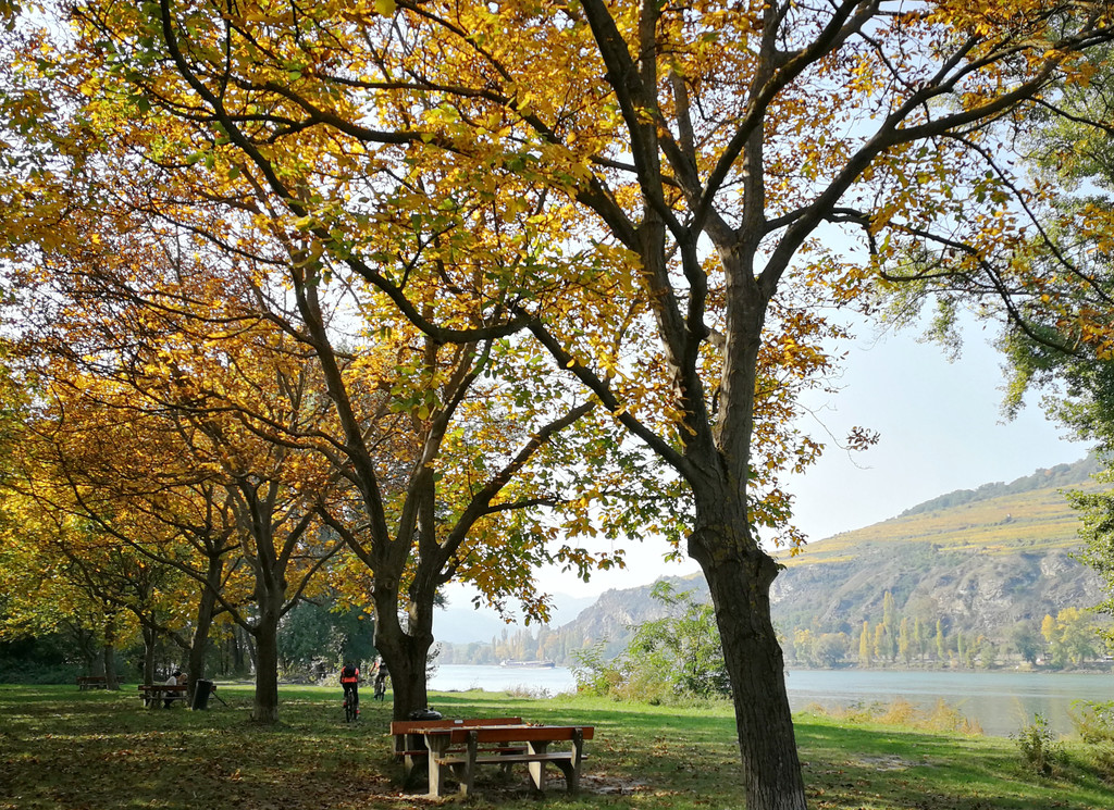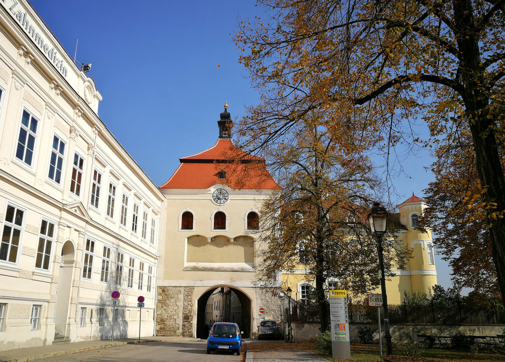 今天准备沿33和3号公路经克雷姆斯-迪恩施泰因(duernstein)(瓦豪谷)欣赏多瑙河畔的秋色。第一站到了“Krems”的小镇,沿途秋色渐浓,经常这小镇的时候觉得秋色非常美,就想停车下来欣赏一下,因为第一次欧洲自驾,不太熟悉怎么停车,看到一些停车场地也没进去,最后到了一学校门口处停了下来,因看到了旁边也有车在停着,但又不知道要不要交费,最后问了两个人才确定可以停。刚才这天是星期六,学校不上学,所以车位也没车停且不收费。