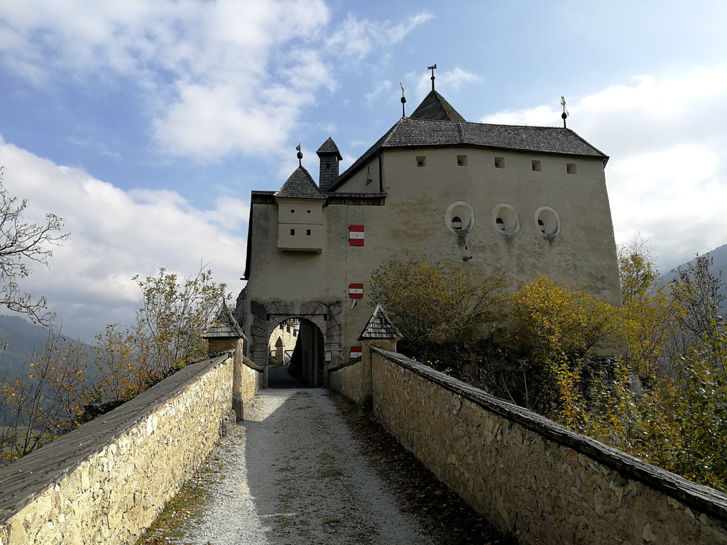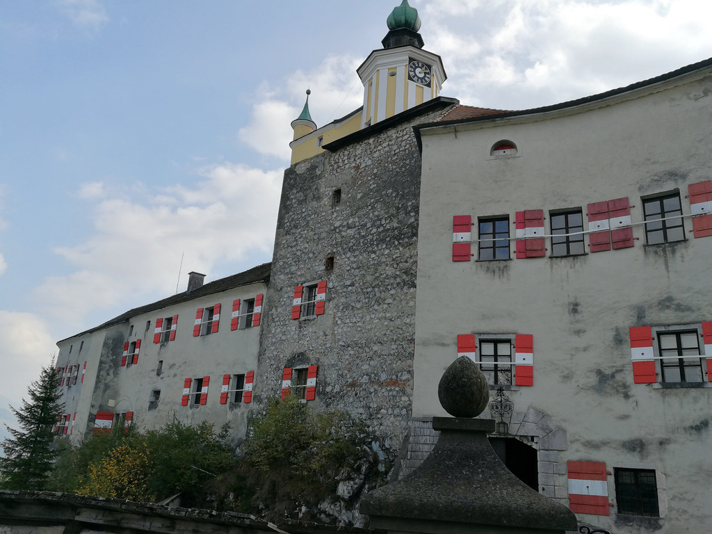 早上往新锡德尔湖(Neusiedlersee)方向开,在a9高速公路上远远的就看到这座高耸在山顶上的城堡,一眼就被它特有的红色吸引住了,决定去参观一下这座充满了奥地利特色的城堡(窗户都是用国旗颜色来做装饰的)。