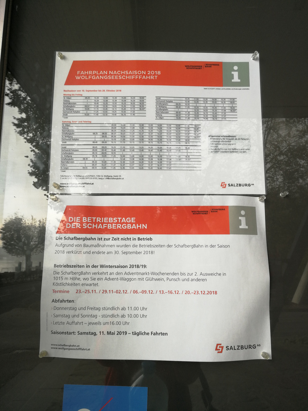 今天打算沃尔夫冈坐蒸汽齿轮小火车上沙夫山看七湖全景的(电影《音乐之声》拍摄地)。齿轮火车Schafberg Mountain Railway是当地特有的观光小火车,已经有120年的历史。结果去了才知道小火车九月底开始停运了。去前最好官网查一下开放时间。