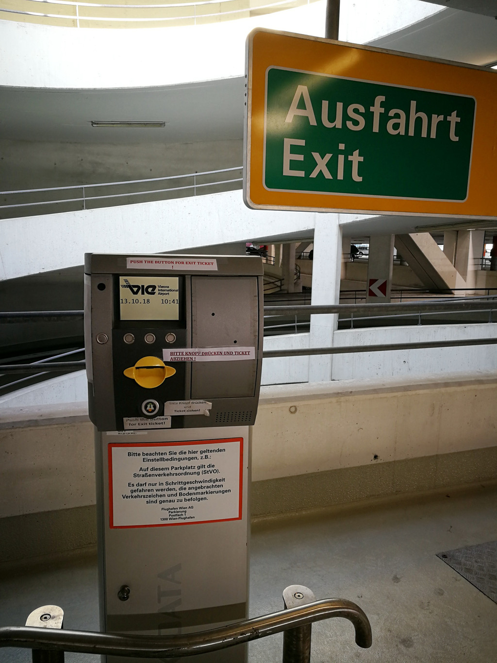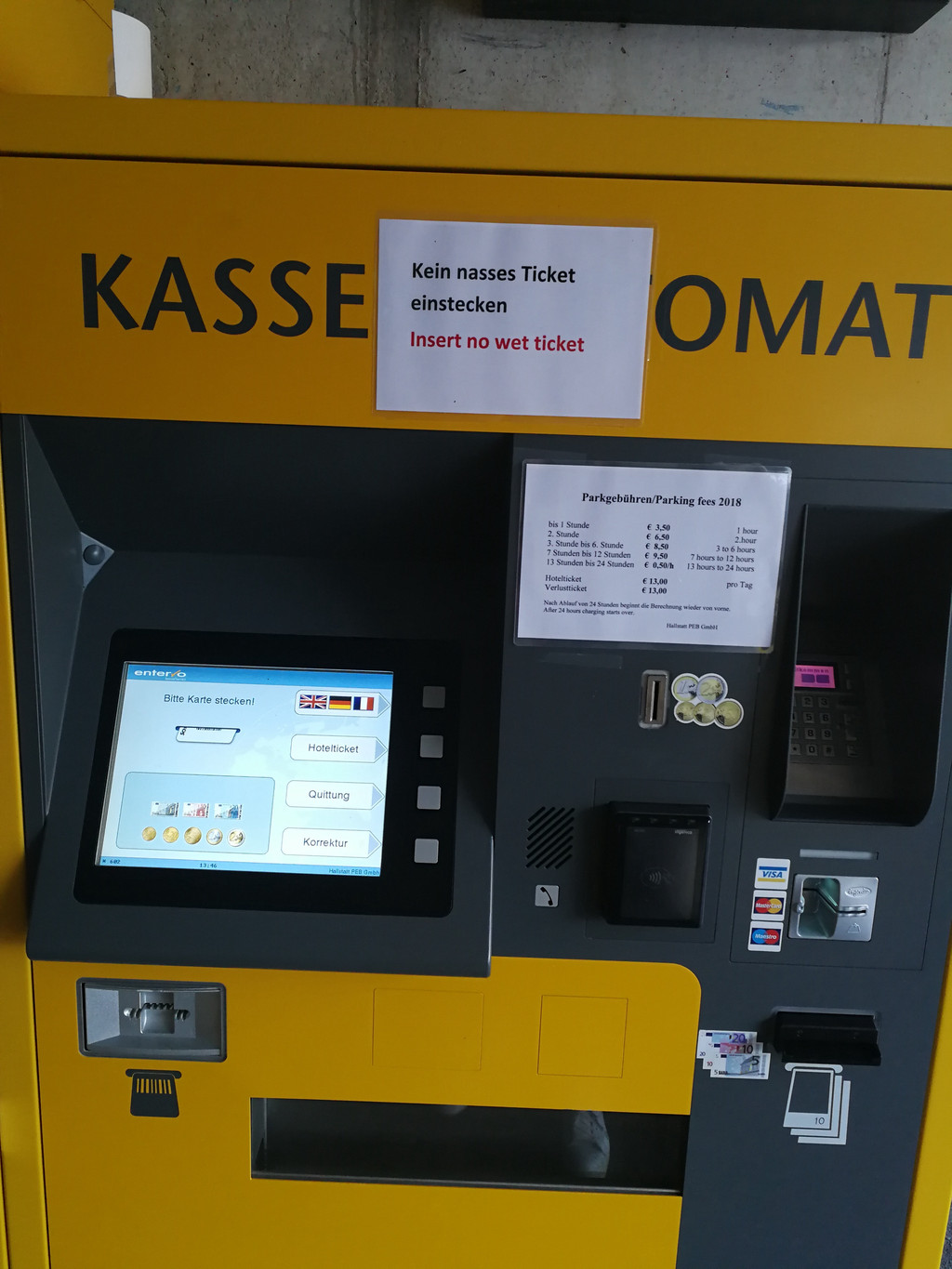 开到六楼遇到一个取卡机,就像国内入口取卡那种(如下图)完全不知道怎么回事了,只好退回七楼看看情况了。然后我又下车看了一下,按键也没什么反应,而且全德文的也不懂,不小心按了紧急电话,但说得也是德文也听不懂。最后只好返回租车处问工作人员了,经过一轮沟通,知道得按键取卡后,到一楼出口再把卡放进去就出场了(等于六楼是车辆入口,一楼是出口),一轮折腾后终于可以出场了。