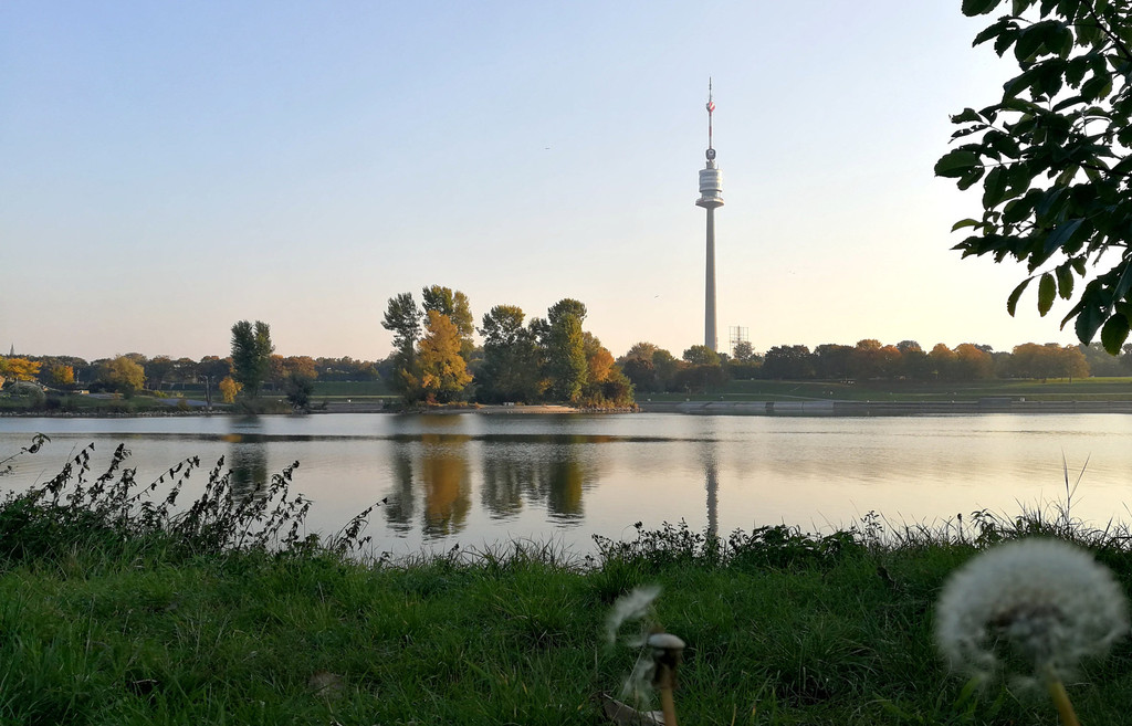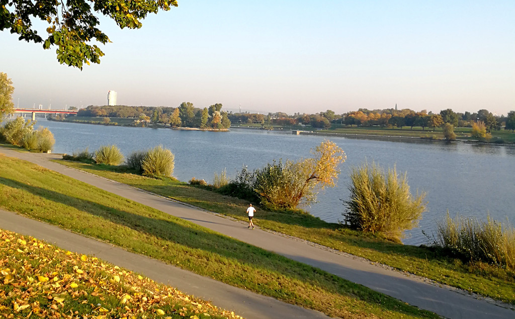 沿着岛中心走去,浓郁的秋色,在阳光下令人迷醉,河对岸的多瑙塔也渡上了一层金光。如果不是时间有限,可以在这里呆久一点,享受着阳光的沐浴。