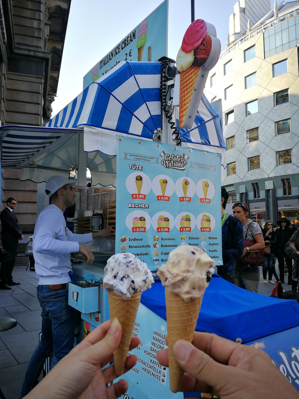 时间有限,只是大致进去参观了一下就出来了,然后转了教堂一圈,在旁边的雪糕档买了两个来吃就继续走(图片是吃着吃着才想起来拍的,完美卖相远离了大家了,只作留念看)。注:当时买雪糕给的是欧元纸币,店主找回来的是硬币,我理所当然的以为是也是欧元来的,结果回来后才发现居然给的是美元硬币,以后得留意一下这个问题。