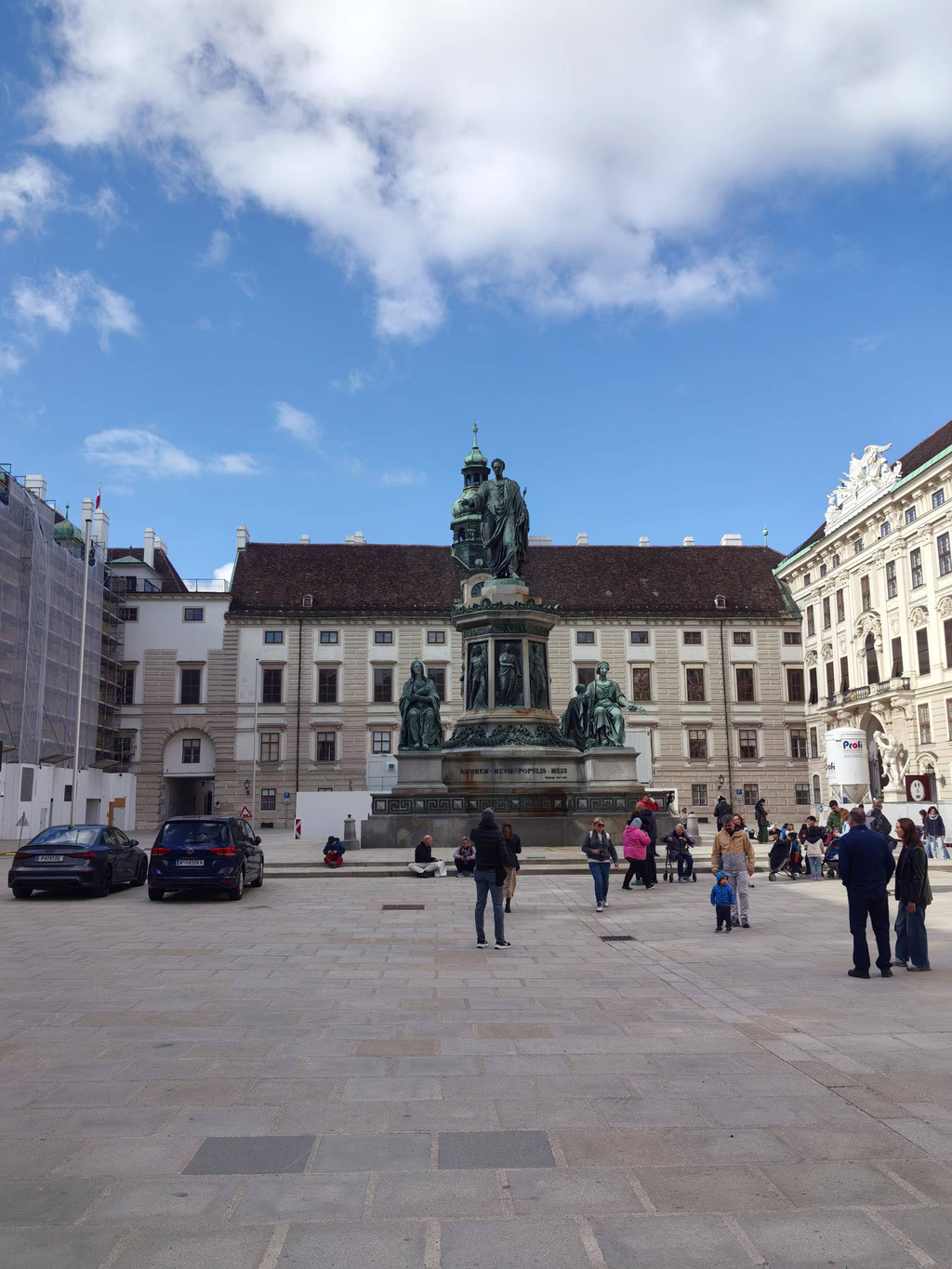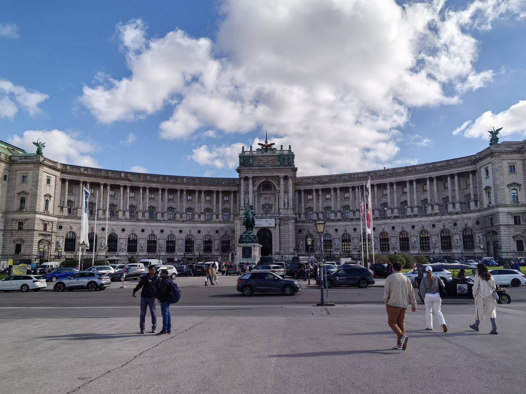 霍夫堡宫:哈布斯堡家族不愧是统治奥地利八百年的家族,中国似乎没有与之匹敌者(周朝虽说也有八百年,但西周开始王室衰微,列国争霸互相讨伐,完全谈不上有效统治)。霍夫堡宫宏伟壮丽,前面的草坪一望无际,天公作美,白云缭绕。