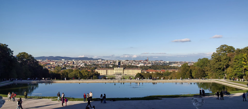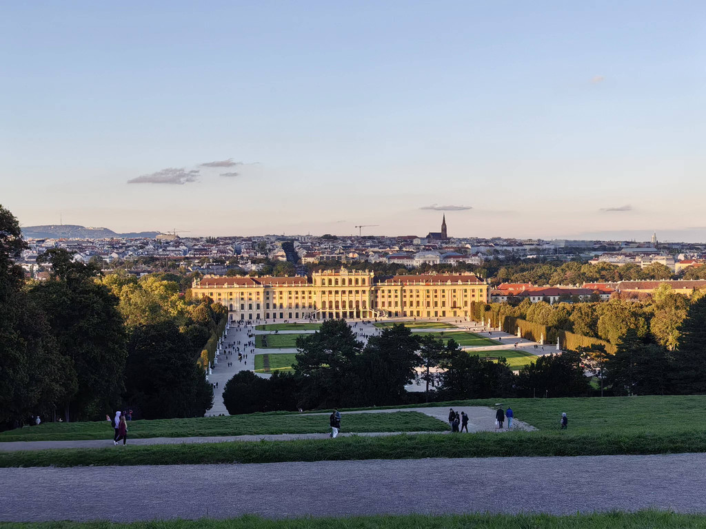 越过主宫殿后的小山才是亮点,在山上往回看美泉宫,在夕阳的映照下分外辉煌。