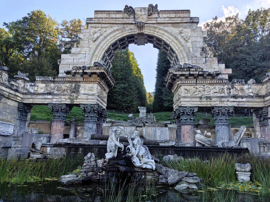 美泉宫占地面积极大,不过应该比颐和园小。总体呈放射线路径设计,有一个地方破壁残垣很像圆明园遗址。