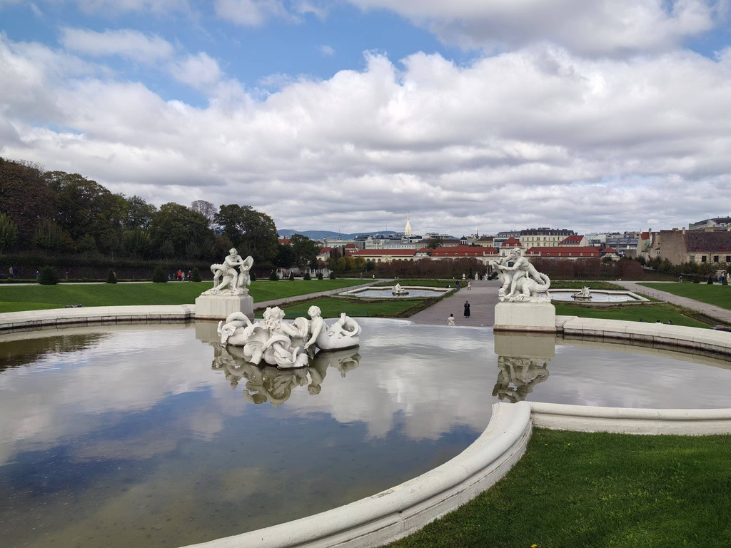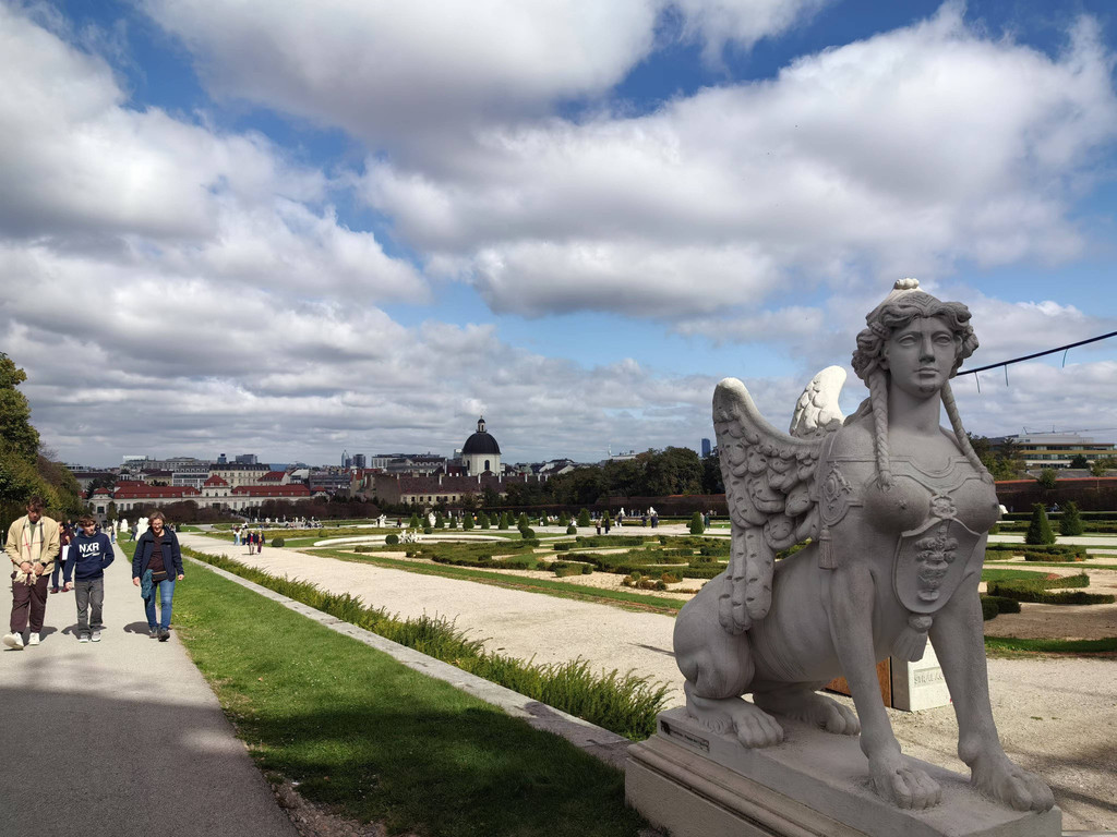 美景宫:绝对是仅次于美泉宫的豪华宫殿,曾是神圣罗马帝国、奥地利帝国、奥匈帝国和哈布斯堡王朝家族的皇宫,茜茜公主曾在此居住。从西门进,一眼即可看到卡尔教堂尖尖的哥特式尖顶。宫内花园极为广阔,长度应有一两公里。走在小碎石铺就的路上,可以一直走到卡尔教堂/卡尔广场。路旁有不少狮身人面像,都是美女面孔袒胸面对。同行者不免疑惑。概西方自古希腊时一直崇尚自然,兼之有尊崇圣母的天主教,整体上是欣赏崇尚母性光辉的。