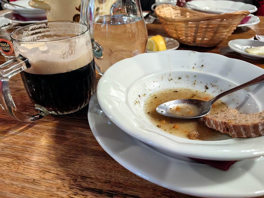 在捷克克鲁姆洛夫游览午餐时,可以畅饮当地的黑啤。