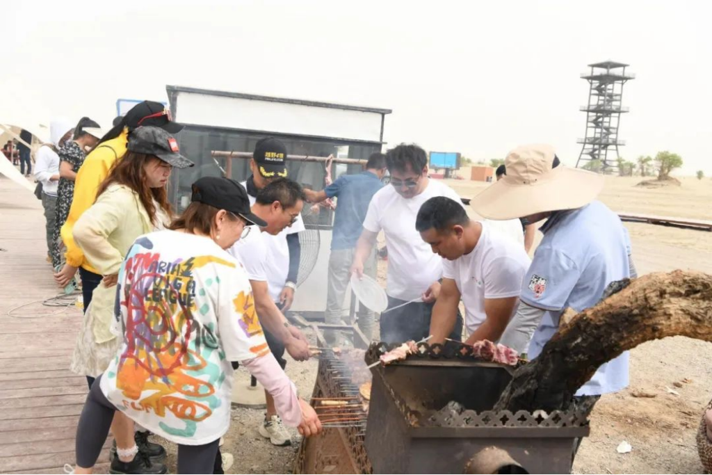 对于越野玩家而言,这里玩法丰富。营地周边沙丘高大、沙子细腻,规划了约16公里的沙漠越野体验环线。既能驾驶越野车在沙海奔腾,又能穿越沙漠丘陵、平坦沙地与胡杨林区,在冲沙爬坡、飞跃沙坑中感受速度与激情,尽情释放越野天性,享受征服复杂地形带来的极致快感。营地为车手们准备了新鲜的全羊,一边烧烤、一边炖肉,直到日落时分,大家才再一次用车轮卷起沙尘归队,并相约待到金秋时节,阿瓦提大漠胡杨金黄灿烂时,再来沙海挑战。