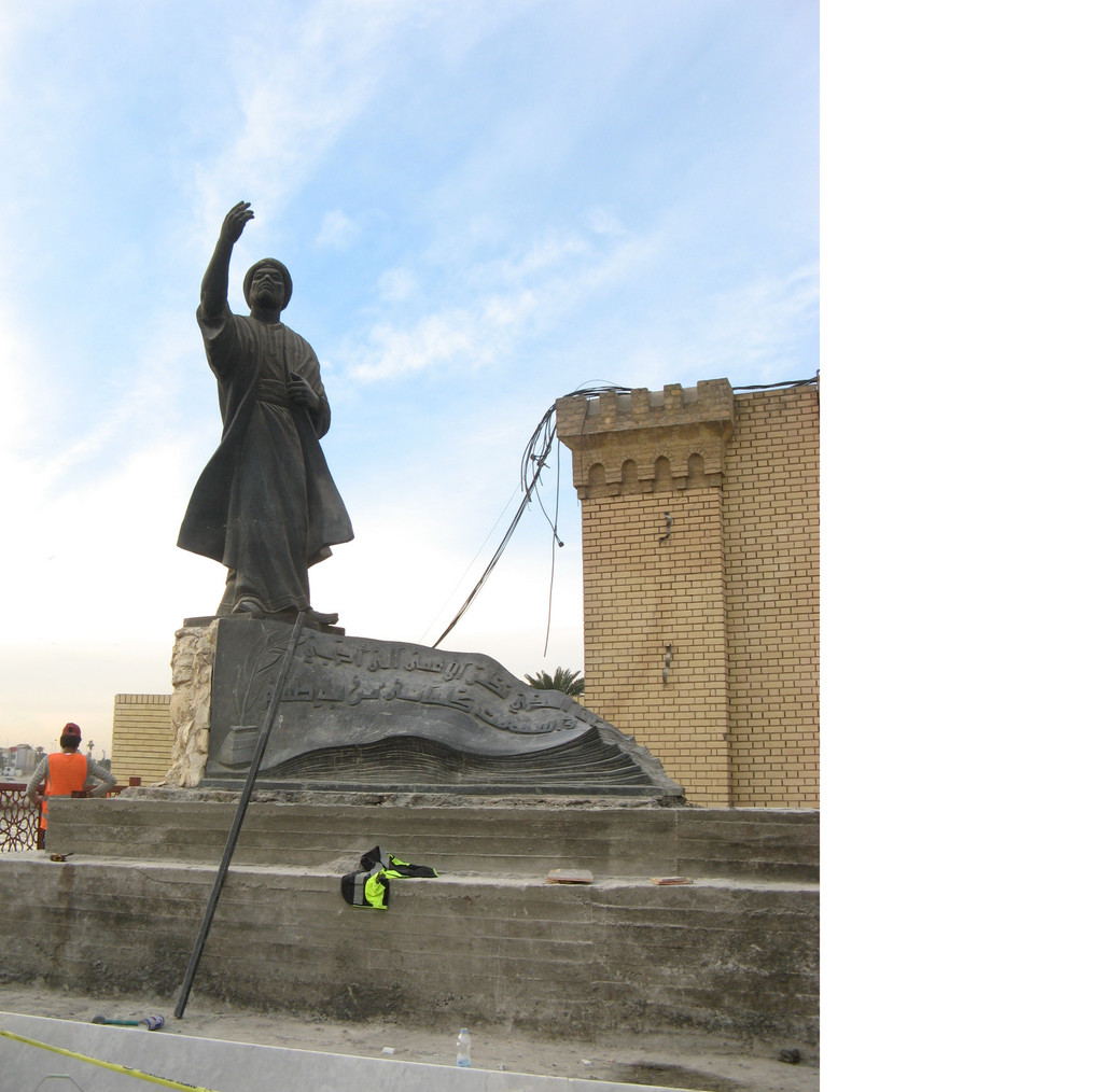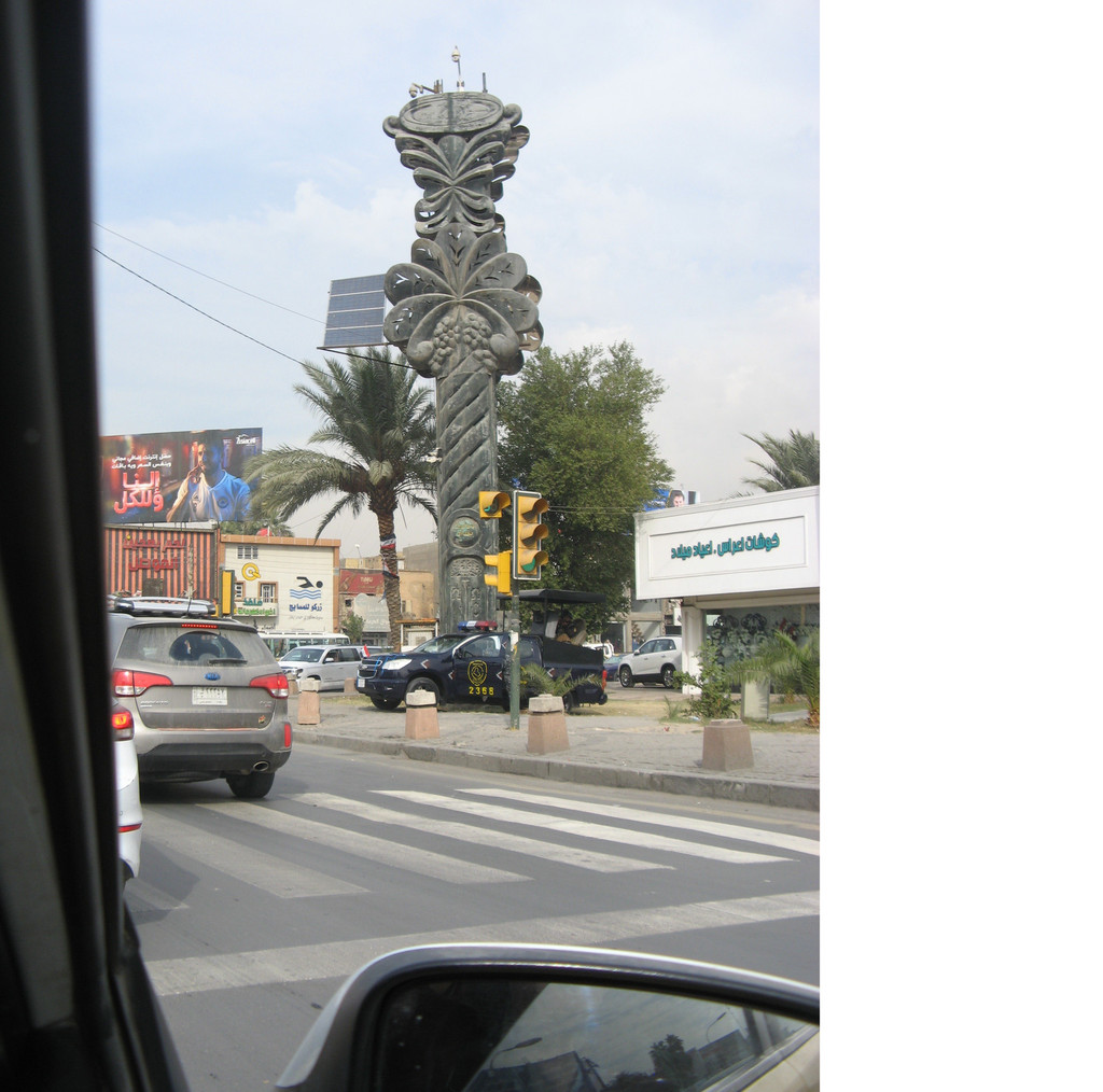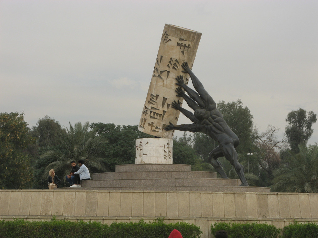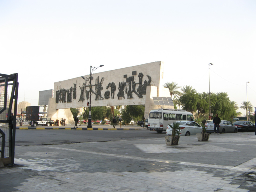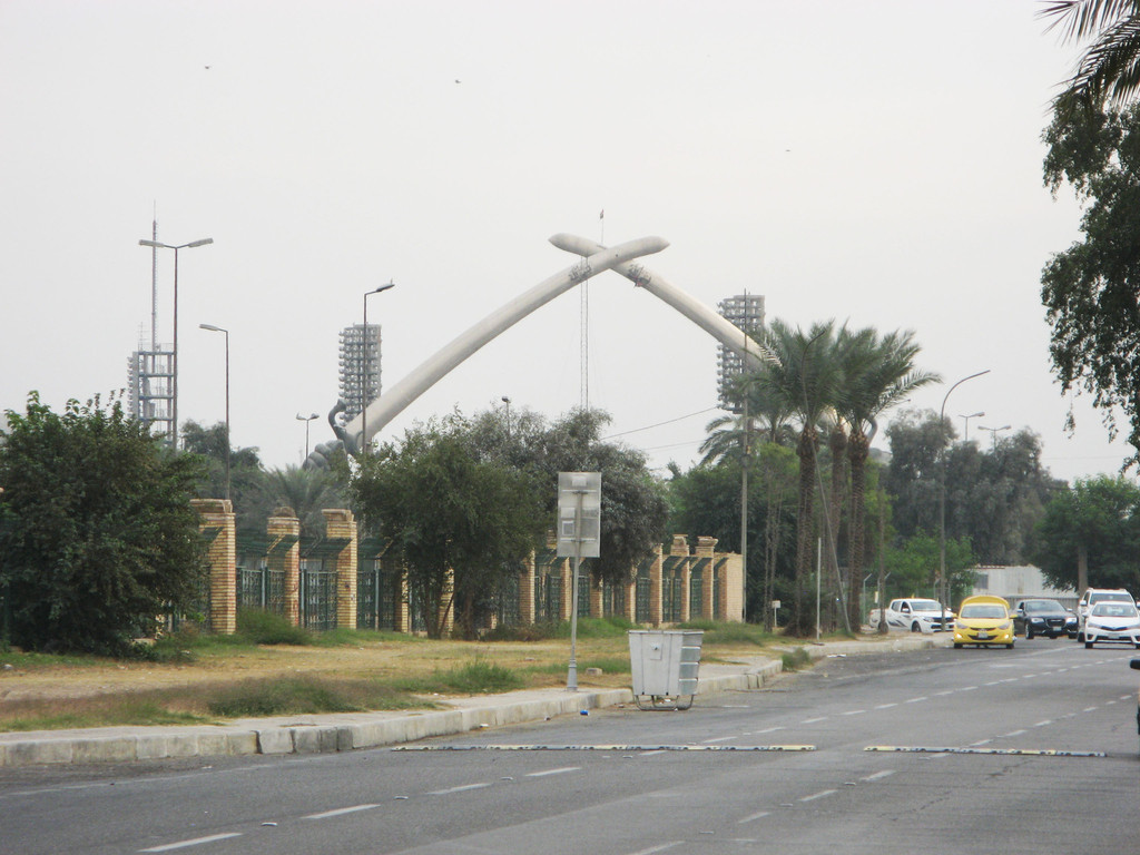 此外,巴格达的解放广场,由于最近的抗议集会而声名远播。从旅馆沿着巴格达主街“萨栋”大道向北漫步不久可至。但为防群体事件,广场已被军警重重包围。那就单刀直入,要求拍照留念。准许之后便堂而皇之。从这里沿着底格里斯河东岸向北不远,就到了诗人穆特纳比的雕像。由此再向北,已被列为河畔一带老城之世遗候选。而从诗人雕像过桥向河西,就到了有名的底格里斯河烤鱼市场。再向西南数百步,依次是国家博物馆,火车站,以及现代购物中心 – 巴格达贸。再向正南方向走上一公里,便到了“绿区”的北缘,隐约可见区内的双剑拱门。除去“绿区”西端被盟军炸烂两次的萨拉姆宫,南缘与东端皆为底格里斯河所围,让政府各部及使领馆坐落其中。