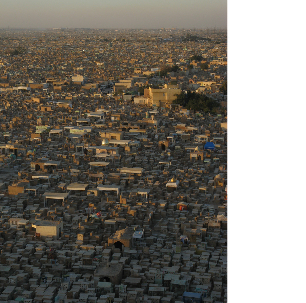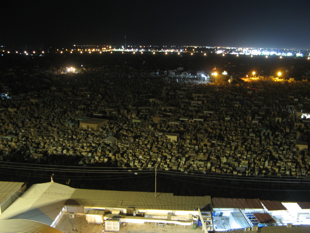 次日打车向东50公里到巴比伦,参观之后向南62公里就可抵达另一圣城纳杰夫。再坐市内出租车到达内环路口,然后由几乎免费的巴士接驳。因语言不通,事先不知内情,致使与司机争执不下。招来警察,方才恍然。进入圣城中心区以后,找到了位置绝佳的棕榈旅馆,恰好坐落在圣殿与墓地之间。在这个旅馆的顶楼露台,往北可以看到一望无际的纳杰夫陵园,号称全球最大的墓地。而向南,则可以俯瞰这金光闪闪的圣殿圆顶,也就是阿里的寝陵。由于圣殿内部更为宏大,因此不再像卡巴拉那样拥挤。