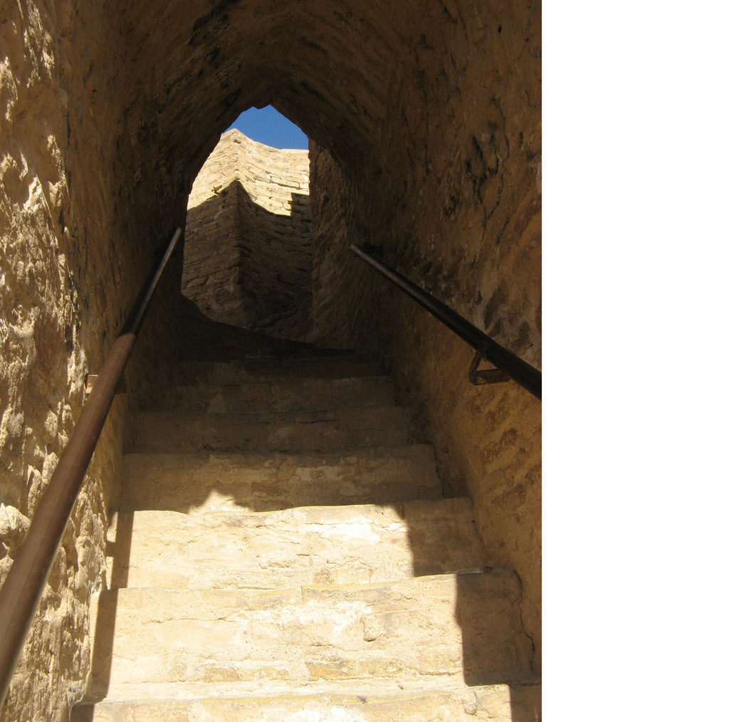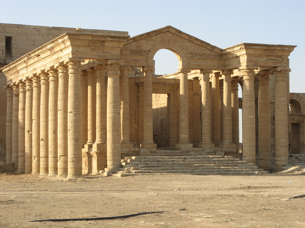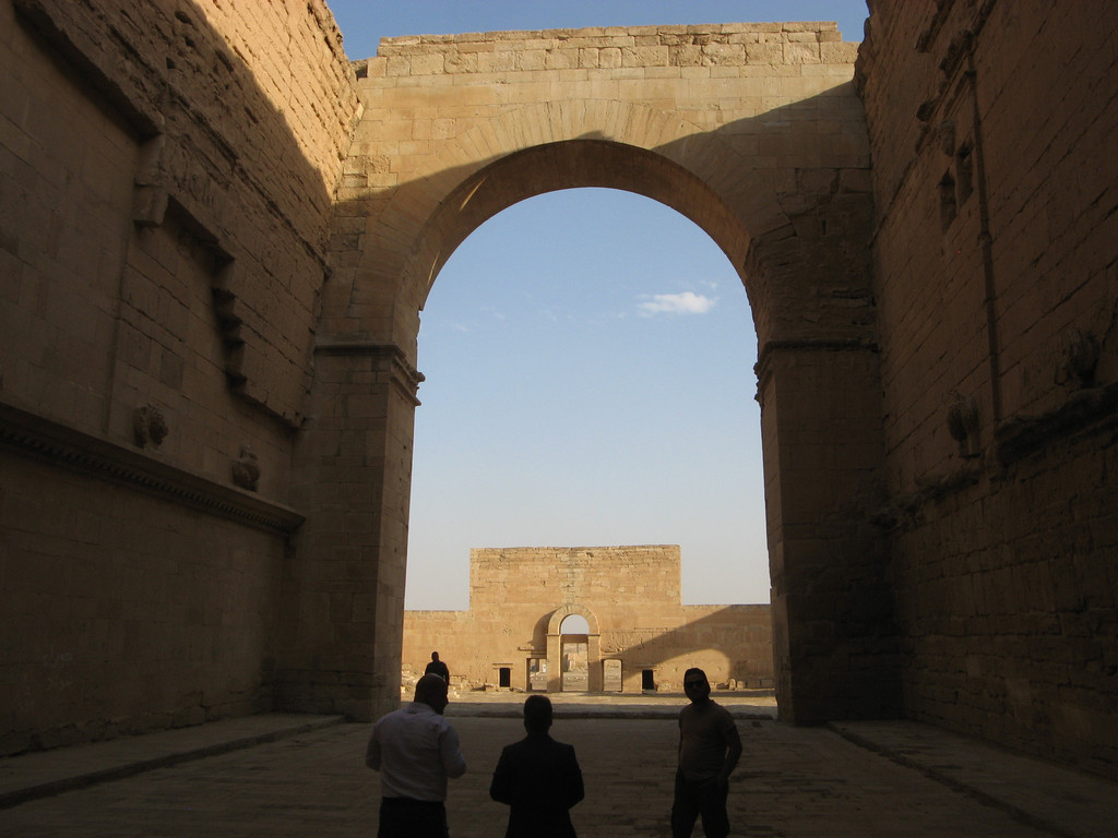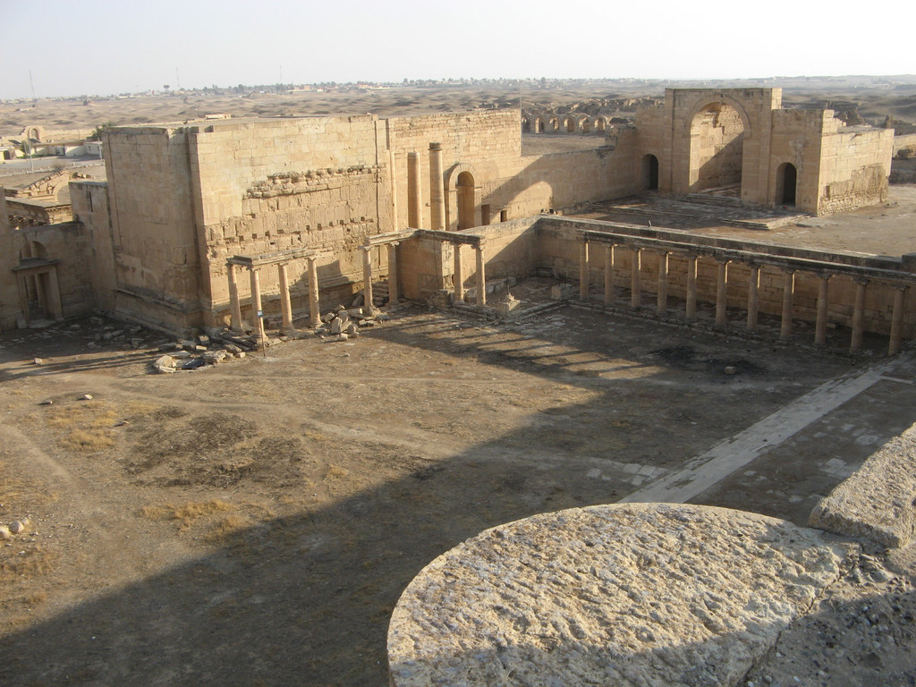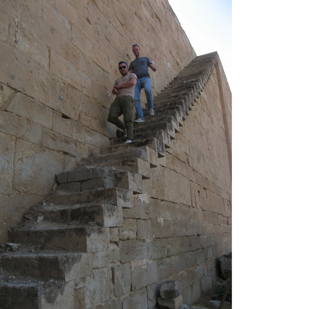 继续向北几十公里,来到了一个向西的岔路口。自此不到30公里,通向伊拉克最早的世界遗产哈特啦。没想到,在这个短短的20多公里路上,竟设有五道检查站,其中一道还具备防坦克的功能。幸好雇了这位司机阿里先生,凭他生花之舌及人脉,每次眼看着要被挡住,却马上又柳暗花明,得以顺利通过检查站。一路上还捎带了2个荷兰自驾小伙。终于在午后时分进入了这个举世闻名的,2200年前帕提亚帝国的要塞。果然名不虚传,哈特拉的宫殿雄伟非常,细腻有加。甚至还有希腊式神殿。只可惜,所有的人头雕像,连同动物,都被伊斯国用机枪扫射,损坏严重。幸运的是,沿着宫墙的台阶还在,可以让我们登上数层楼高的宫墙顶部,欣赏上层结构,俯瞰四面八方。