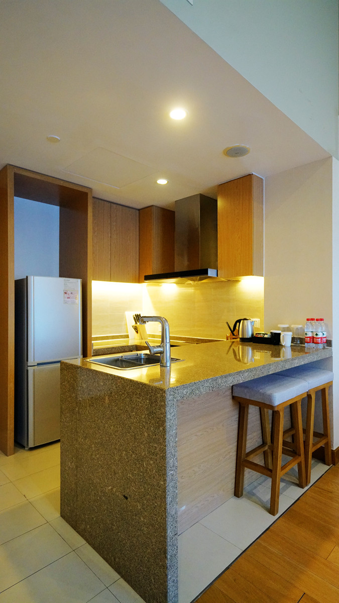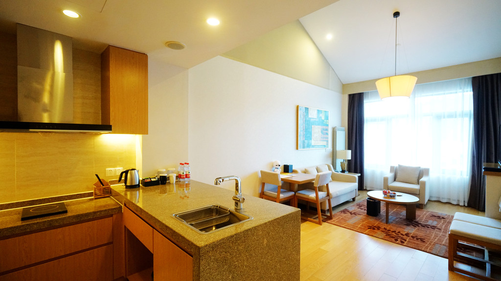 长白山万达假日套房酒店的小厨房设施齐全,可以做一些自己喜欢吃的食物,晚上闲暇之余还可以在这个小吧台和小朋友小酌一番,给滑了一天雪的疲惫身体得到难得的放松时刻。