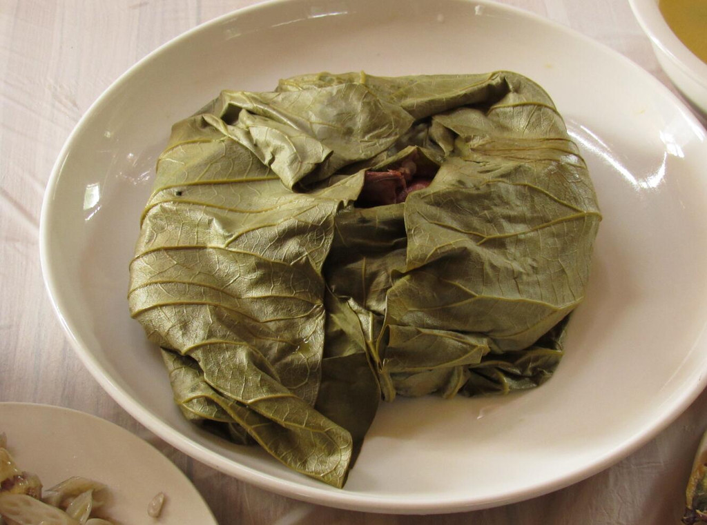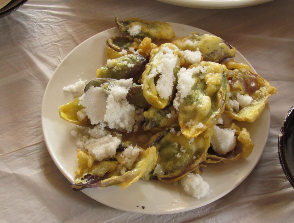 《胖墩度假村》荷叶鸡:当地一日游团餐の主菜:炸茄片蘸白糖,厨子水平不错,茄片切得真薄啊~