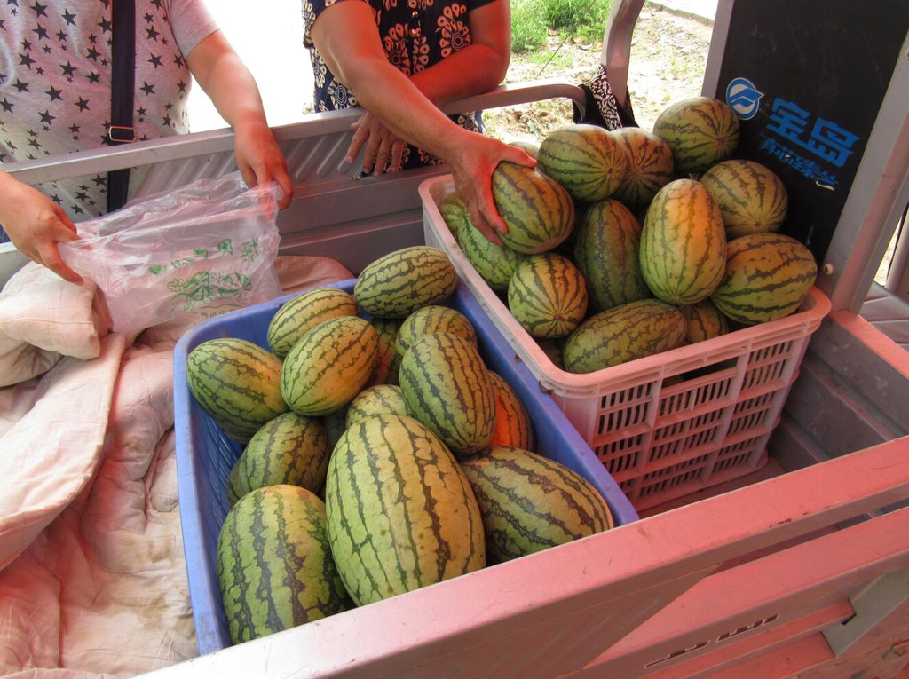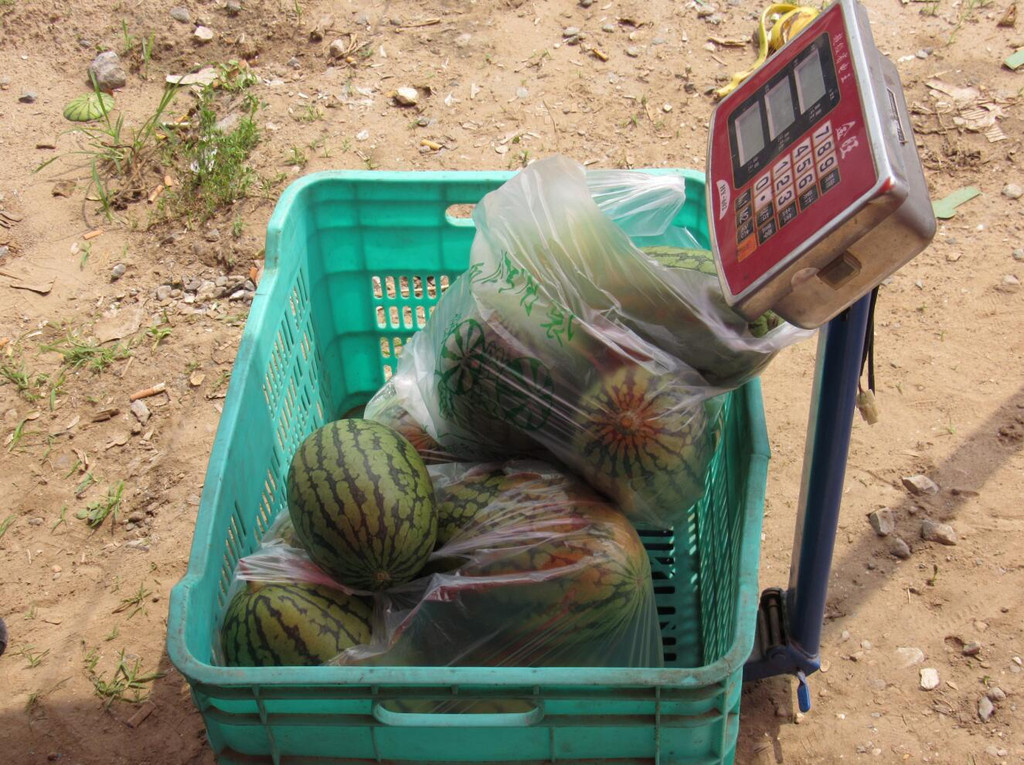 这已是第二茬西瓜,质量远不及前一批,店家给我们打了八折,于是我们买了很多准备回去分给朋友们一起品尝。