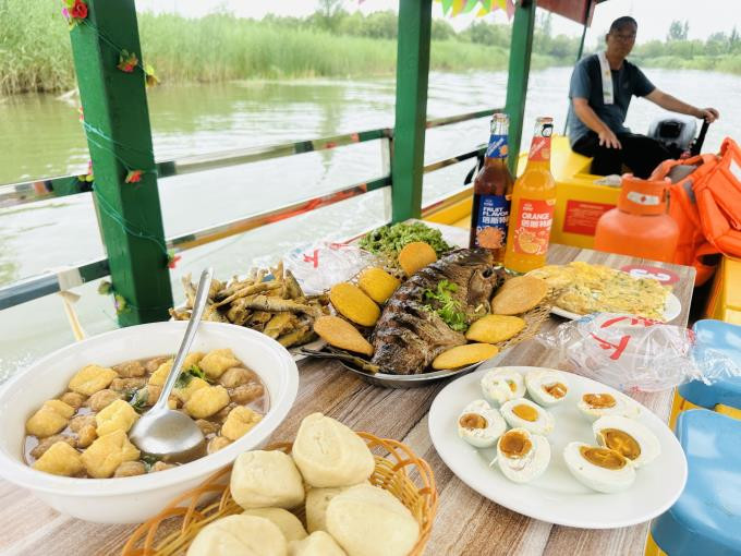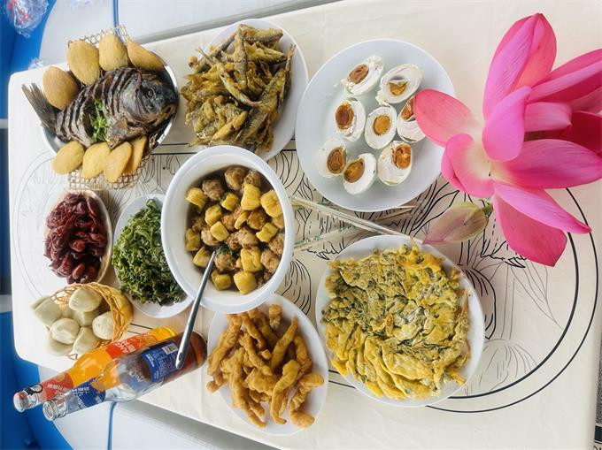 餐饮美食:野生炖大鱼、麻辣小龙虾、荷叶尖摊鸡蛋、爆汁咸鸭蛋、炸小鱼、炒黑鱼片、河虾韭菜、凉拌荷叶卷。