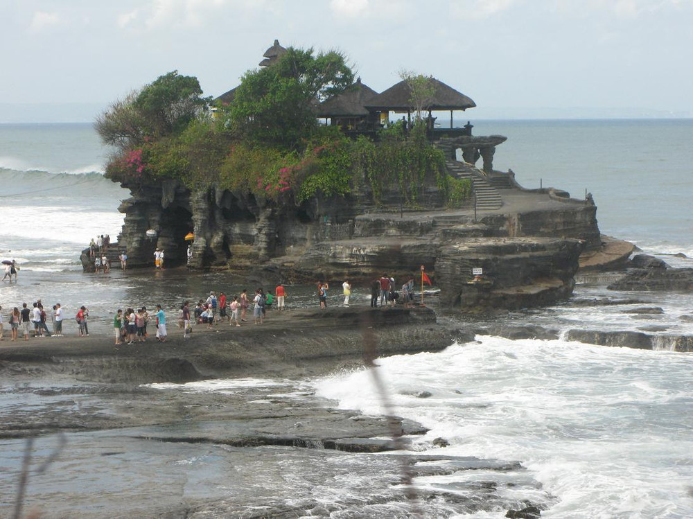 盖在海边的一块巨岩上,它是巴厘岛最著名的寺庙之一。涨潮时,此庙四周环绕海水,和陆地完全隔离。落潮时方可以相通。海神庙建于十六世纪,祭祀海神。巨岩下方对岸岩壁,有一小穴发现几条有毒的海蛇,传说是此寺庙守护神,防止恶魔和其他的入侵者。据说寺庙建成时忽逢巨浪,寺庙岌岌可危,于是寺内和尚解下身上腰带拋入海中,腰带化为两条海蛇,终于镇住风浪。从此海蛇也成为寺庙的守护神。对岸有小亭可以眺望日落景色,成为巴厘岛的一大圣景。庙前两侧有很多商店卖纪念品,更有很多小孩围着游客兜售风景明信片。