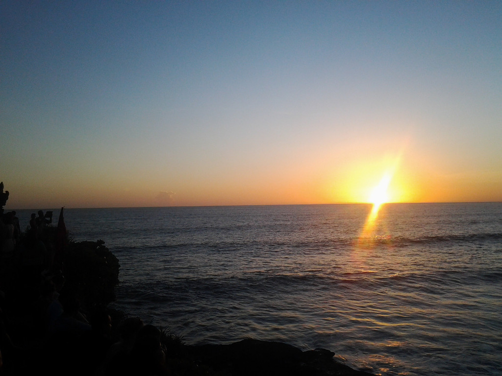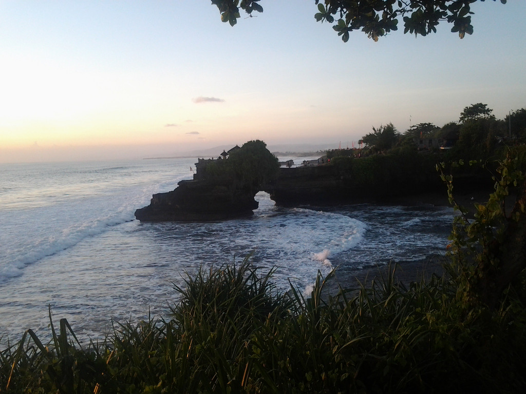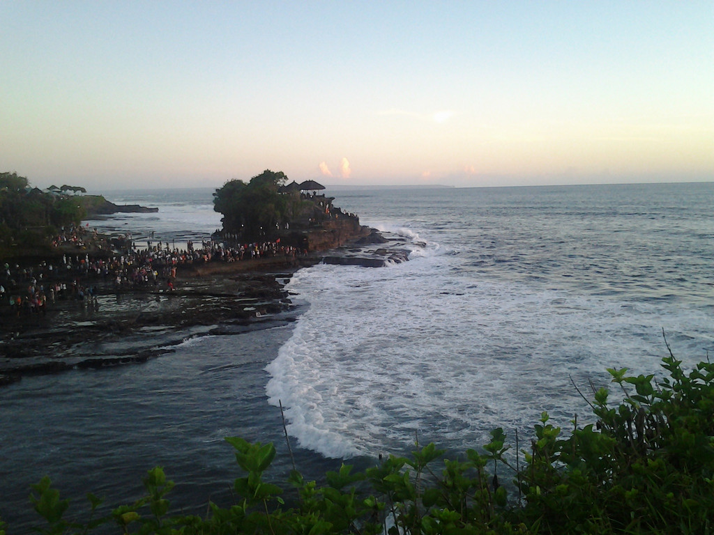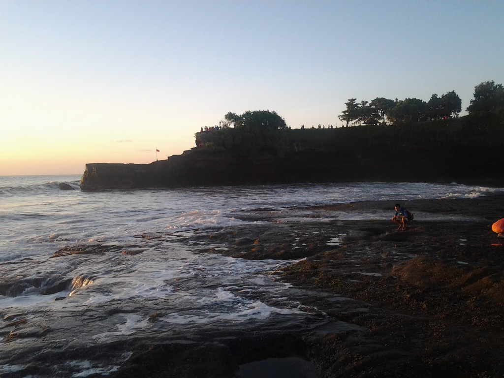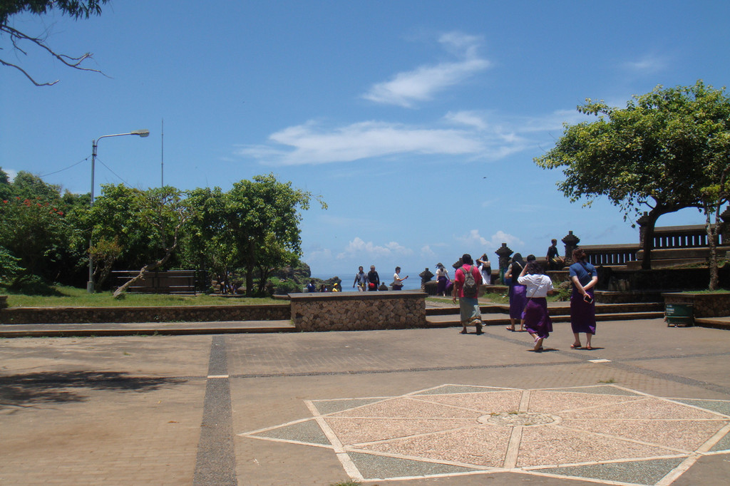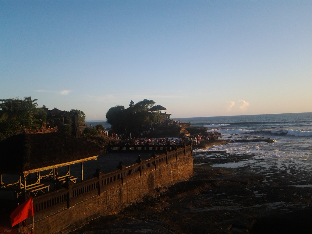 海神庙盖在海边的一块巨岩上,它是巴厘岛最著名的寺庙之一。涨潮时,庙的四周环绕海水,和陆地完全隔离。落潮时方可以相通。
