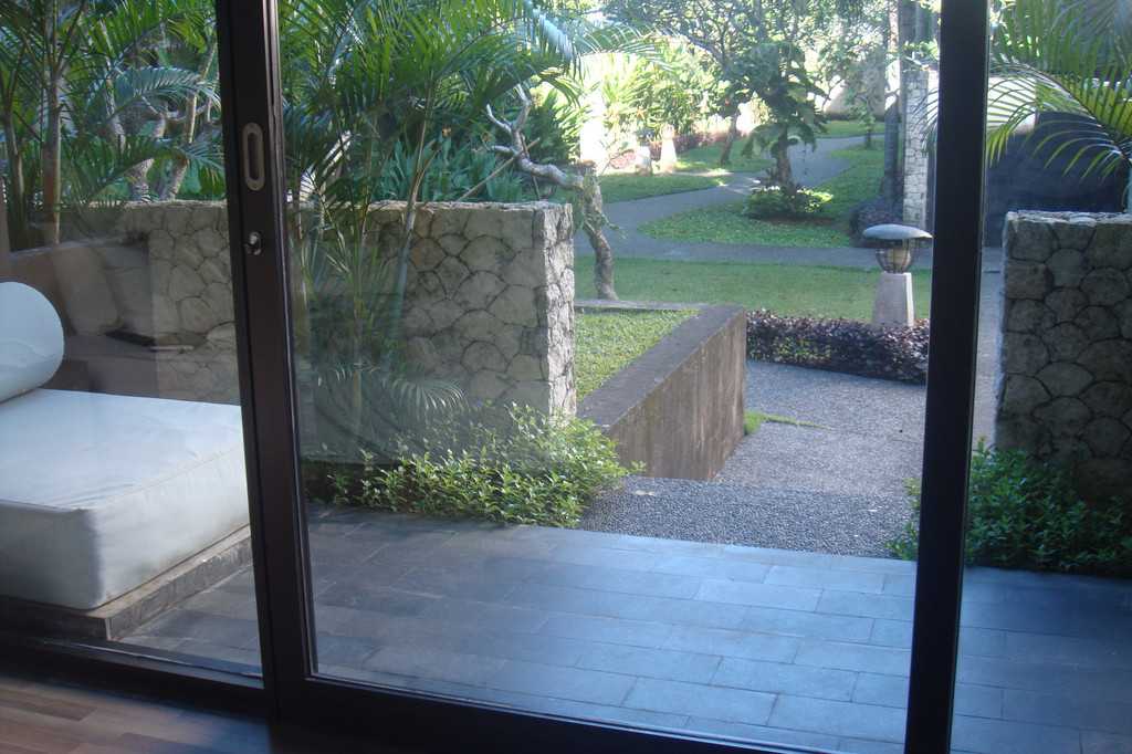 延续了上一个酒店的传统,早上竟然还是从鸟鸣中醒来,这里果然宜居啊!这是落地门,可以从这里直接走到庭院里。看着满眼的绿色,心情舒畅。