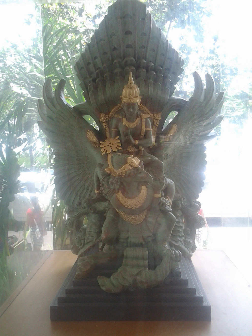 神鹰广场本来要竖起一座世界上最高大的神鹰铜像的,神鹰背上骑着巴厘岛的最高神明——破坏神。可是后来由于资金不足,没有完成。下面这座铜像是在神鹰广场的接待处摆放的,如果神鹰雕像能够被建成,这就是他的全貌了。