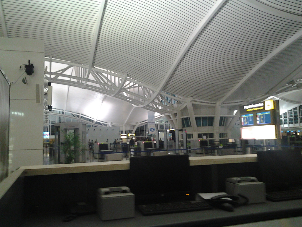 12:30机场广播通知可以办理,托着行李到达15-18号柜台前排队等候。由于我从大连飞仁川,再由仁川飞登巴萨,全程都乘坐大韩航空公司的飞机,所以,我可以直接将行李托运到巴厘岛,并且在此时直接换成两段的登机牌。
