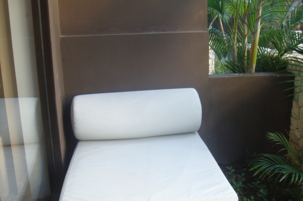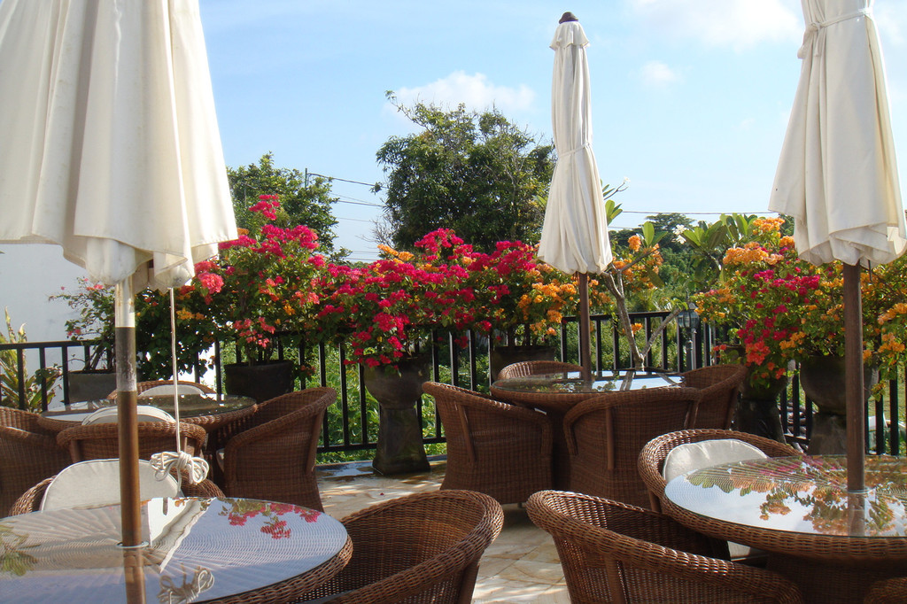 在门口有躺椅和餐桌。这里你可以在餐厅吃早餐,也可以叫早餐到房间来吃。