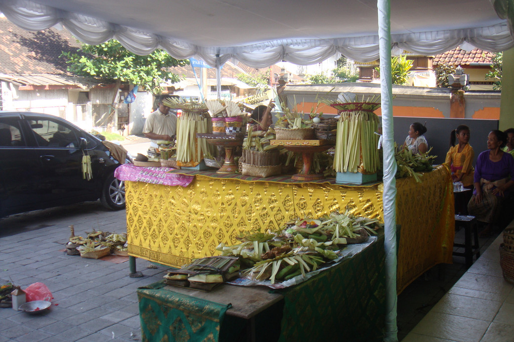逛街的过程中,倒是遇到一件我比较感兴趣的事情,好像是巴厘岛当地人在祭神,很庄重,准备了很多东西,有很多人在做这个仪式,并且不同的人有不同的分工和职责。