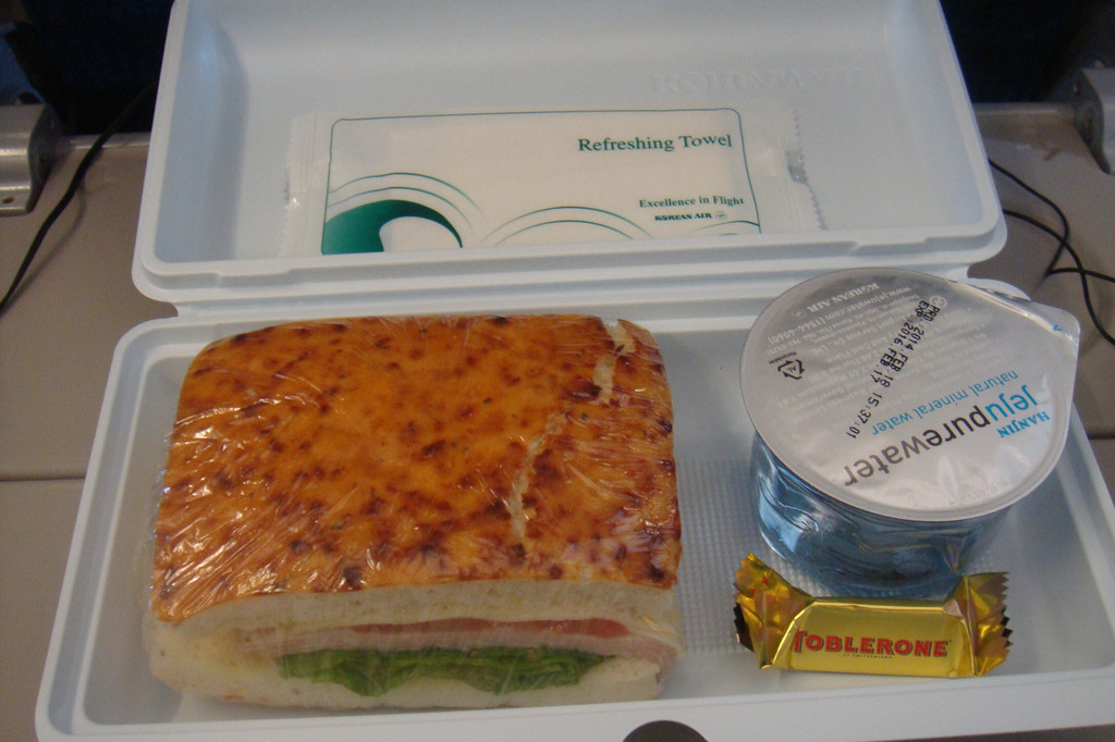 第一段大连飞仁川已经没有靠窗的了,所以她给我一个靠前的过道的位置,我比较满意。飞机餐,是一个三明治。