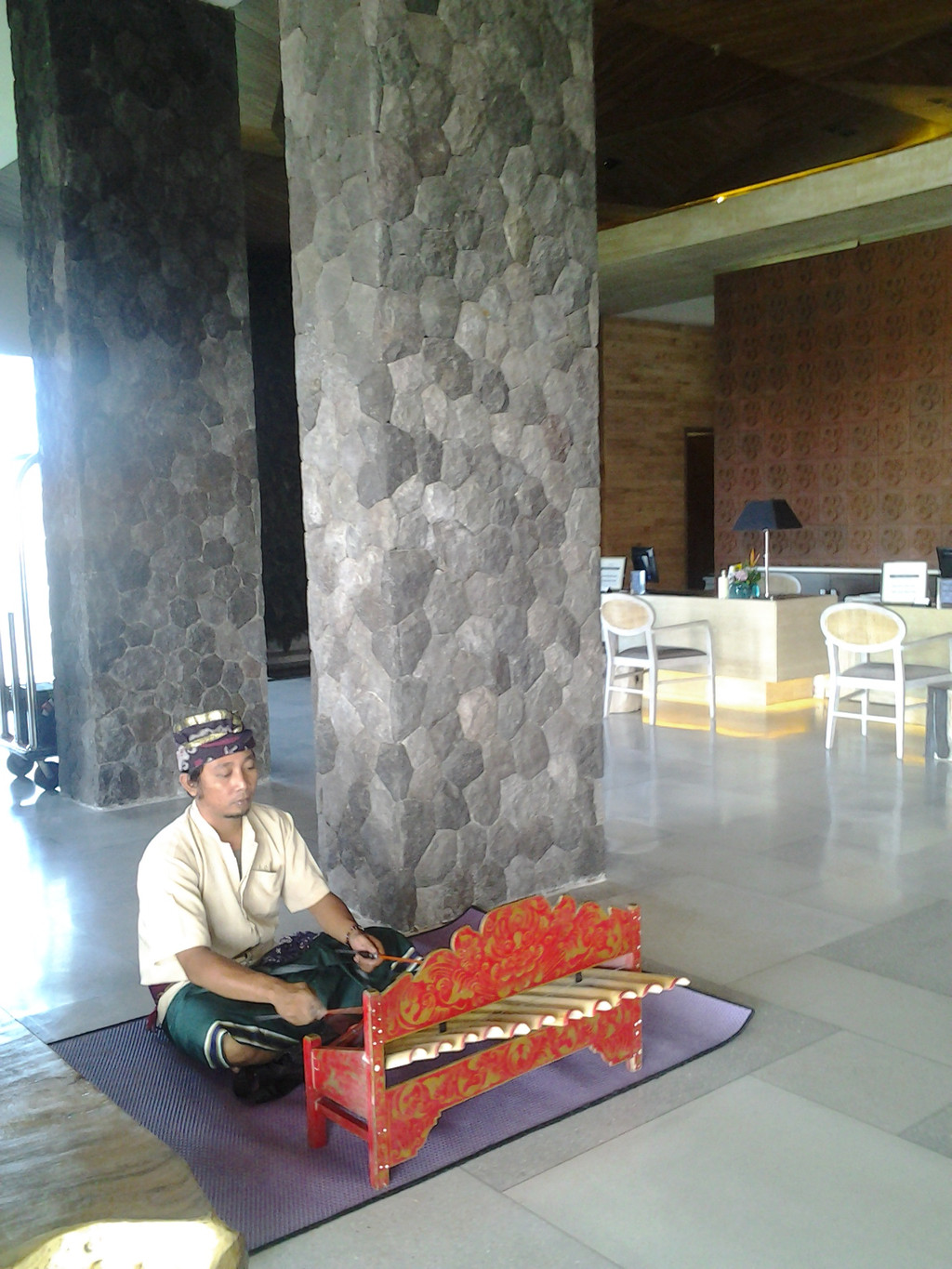 酒店大堂的摆设和演奏当地乐器的巴厘岛当地人。