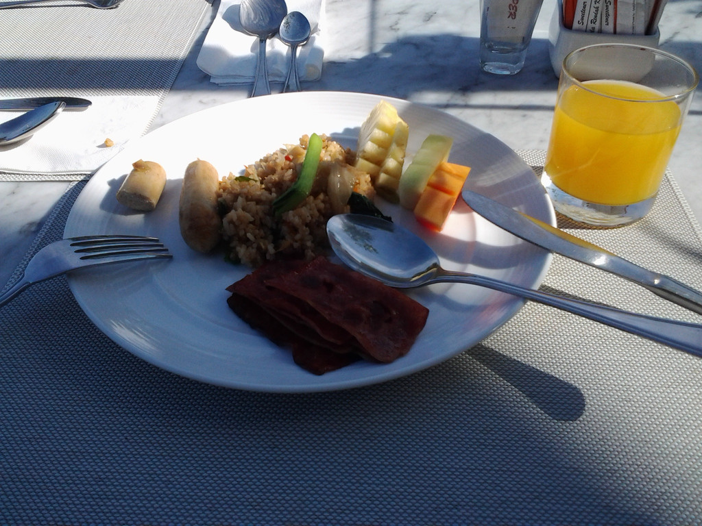 下楼吃自助早餐,可能对于习惯早餐吃小米粥包子或者是豆浆油条的中国人来说,炒面,炒饭,培根,煎蛋,沙拉,水果等一系列的美式或者印尼当地特色的早餐你会吃不习惯,但是确实比较丰富,你可以选择自己可以接受的,或者都尝试一下,毕竟在国外却要一直吃中国的食物会有点遗憾的。