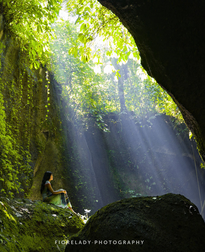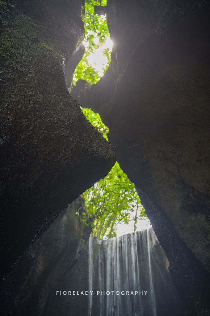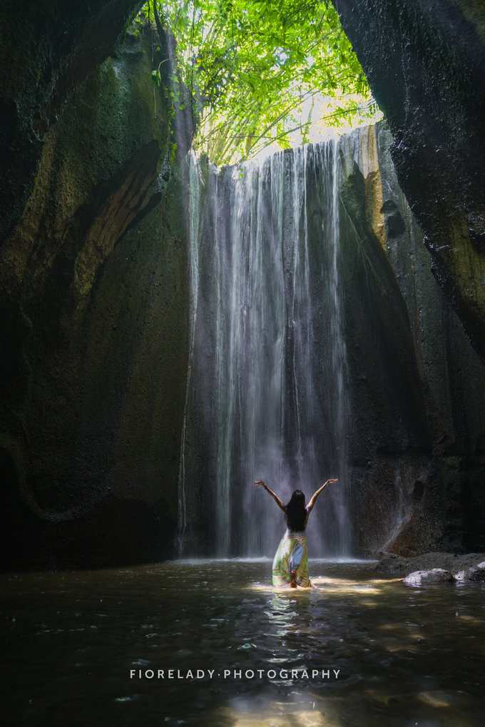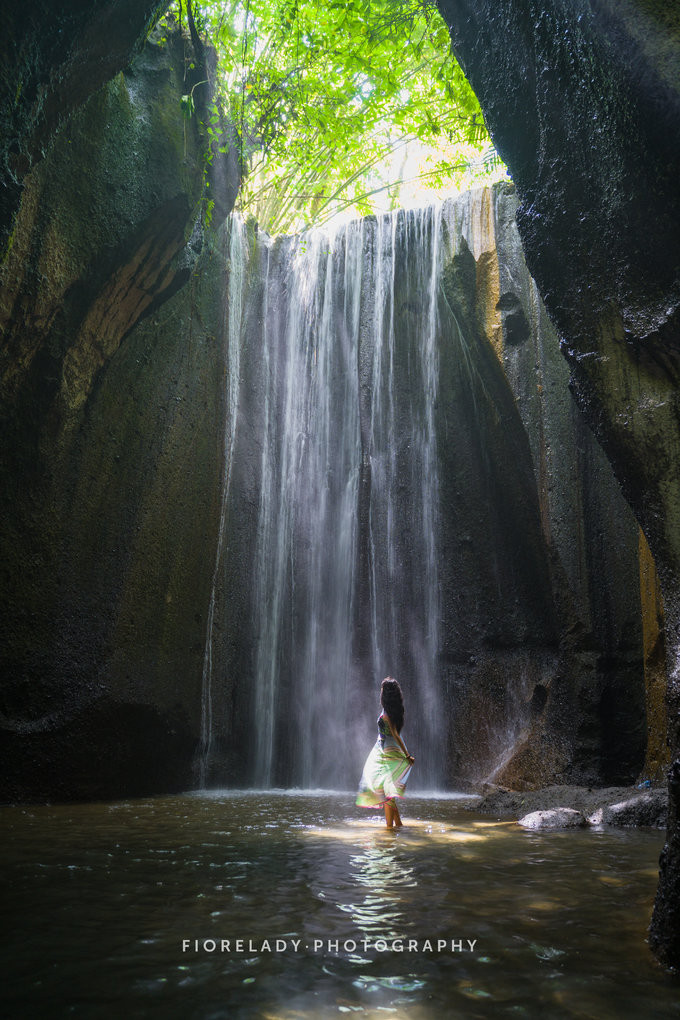 此时瀑布落下的轰鸣声和飘起的水雾还是蛮大的,拎起裙角慢慢走到瀑布的前方,阳光正好从上方的洞口照射进来投在身上,与周围暗黑的山洞形成了鲜明的对比,这也许是巴厘岛瀑布中最美的光与影了吧!