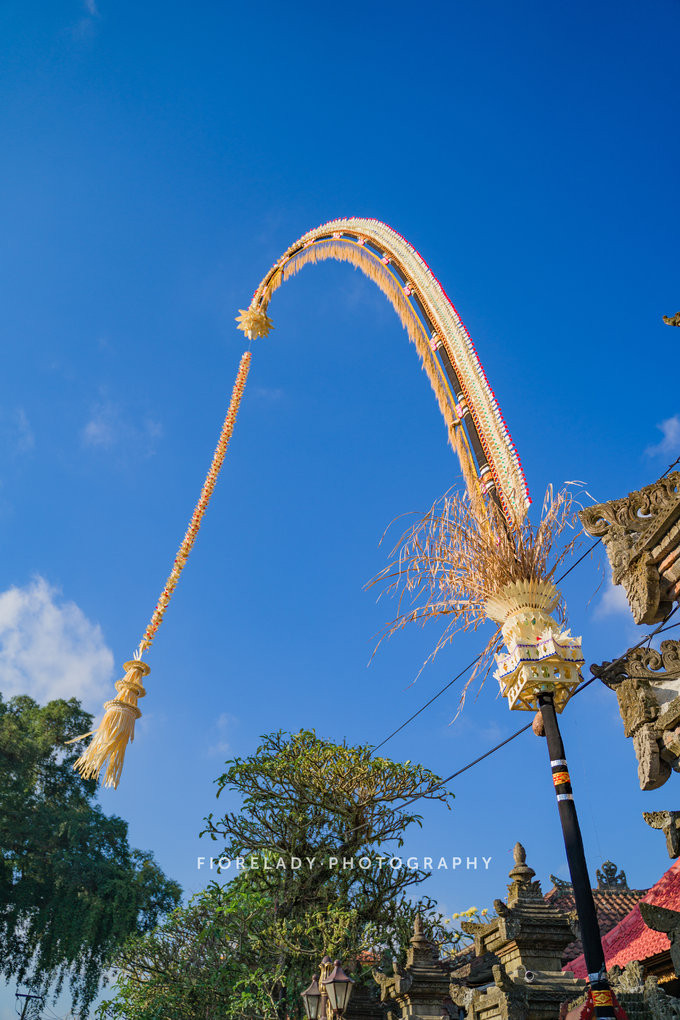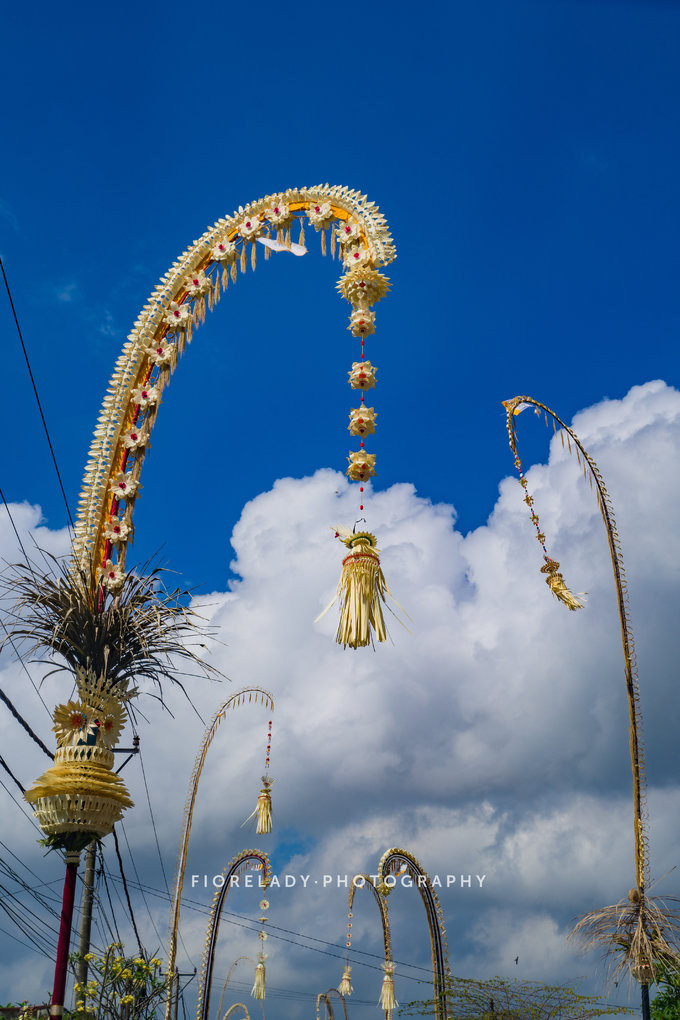 Penjor的竹竿主体象征着“龙”的形体,搭配椰子叶编出吊穗随风摆动,离地1、2米的竹篙祭台里会摆上各种供品!这些随风飘动着的Penjor的圣景,也只有在信奉印度教的巴厘岛才能看到,被称为“巴厘岛的美学”。