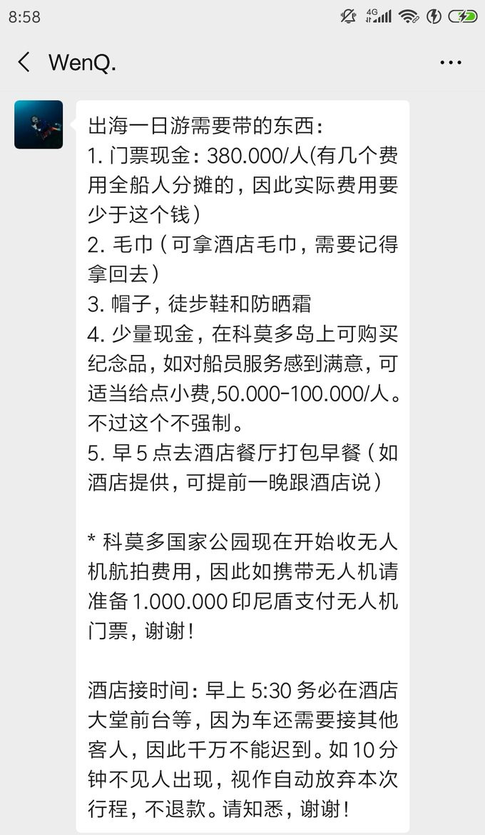 3)老板WenQ也是潜水爱好者,虽然我们没有见到面,但在国内我就加了她的wx,之后便开始询问各种巴厘岛、科莫多岛的问题,她白天出海,回复的慢,但每次总是很详尽到位的回复,有问必答,还给了我不少靠谱的推荐,总之很感谢她!(需要老板wx的可以私信我哈)